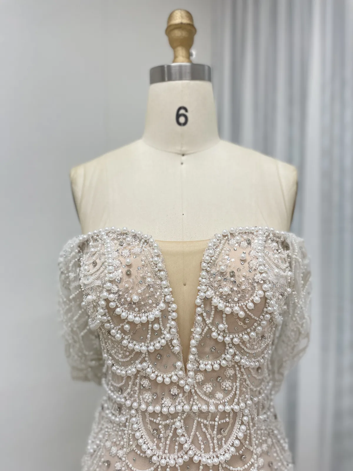 The gown boasts a romantic off-the-shoulder neckline with delicate, sheer draped sleeves, adding an ethereal touch to the décolletage. A subtle illusion plunging V-neck adds a hint of allure without compromising elegance. For an added touch of drama, a lightweight, ethereal tulle overskirt or train flows gracefully from the waist, offering a versatile two-in-one look. This gown is an unforgettable choice for a vintage-themed wedding, a formal gala, a grand evening event, or any occasion where you wish to exude timeless sophistication.