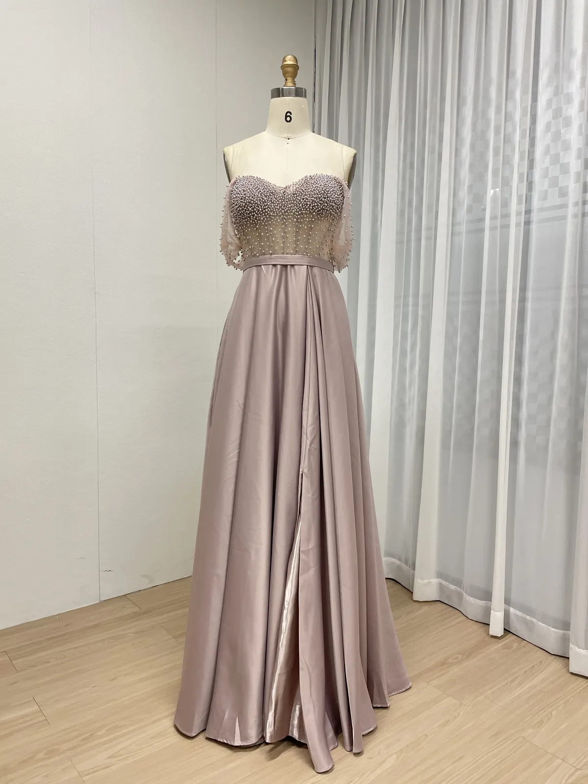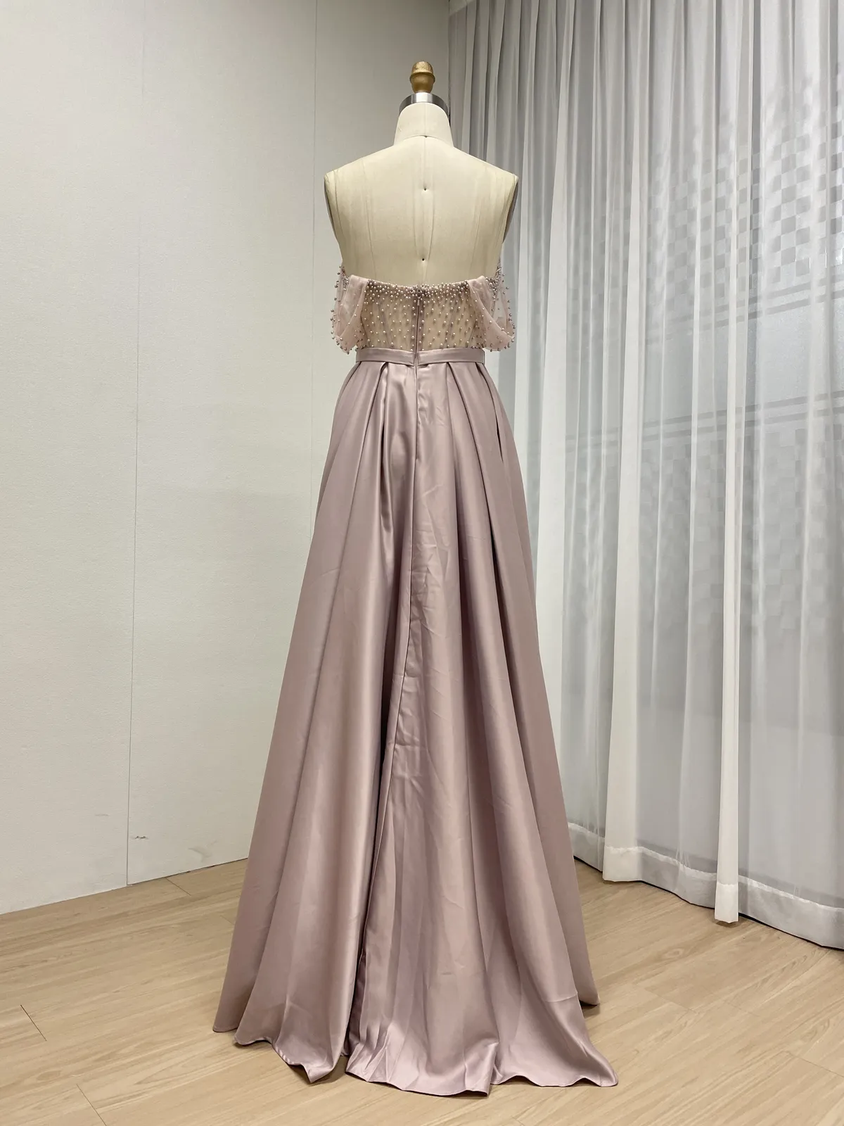 The standout feature is the beautifully draped, off-the-shoulder bodice. This delicate overlay creates a soft, romantic capelet effect over the sweetheart neckline, offering a unique and ethereal twist on a classic design. Available in a soft Blush Pink and a glamorous Champagne Gold, this gown is the perfect choice for a formal wedding, gala, or any special occasion where you want to radiate sophistication and charm.