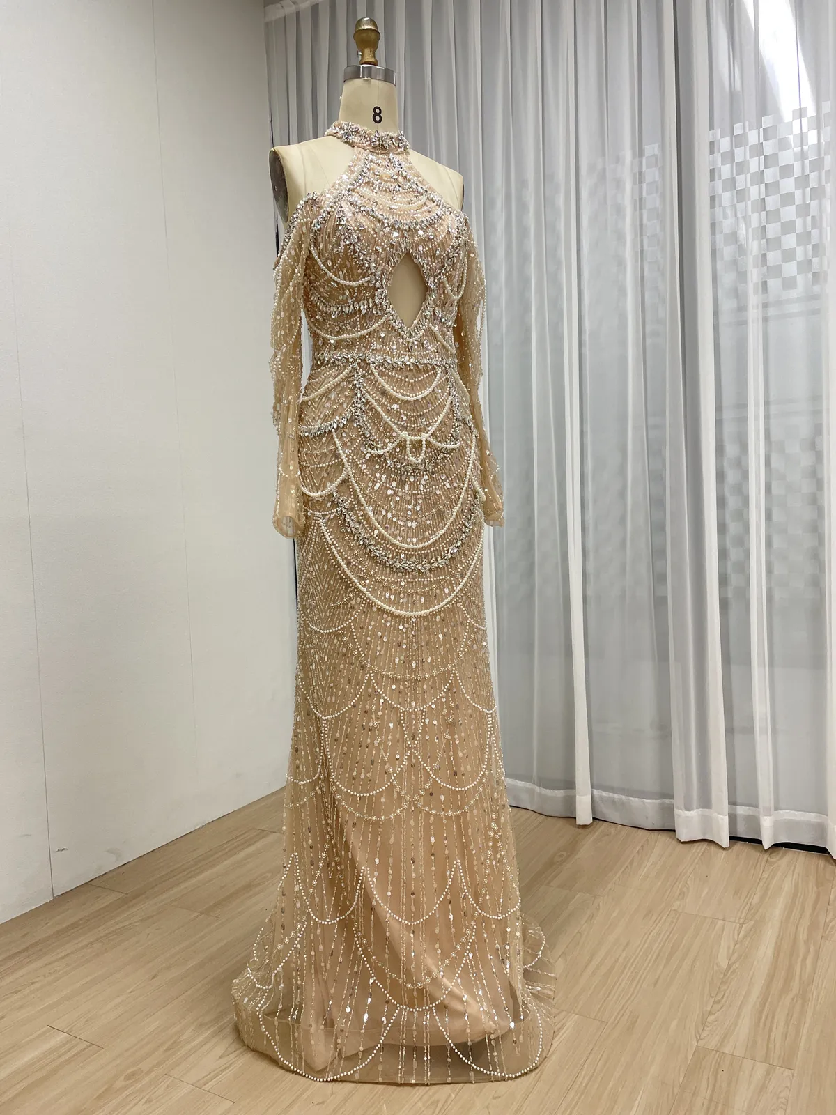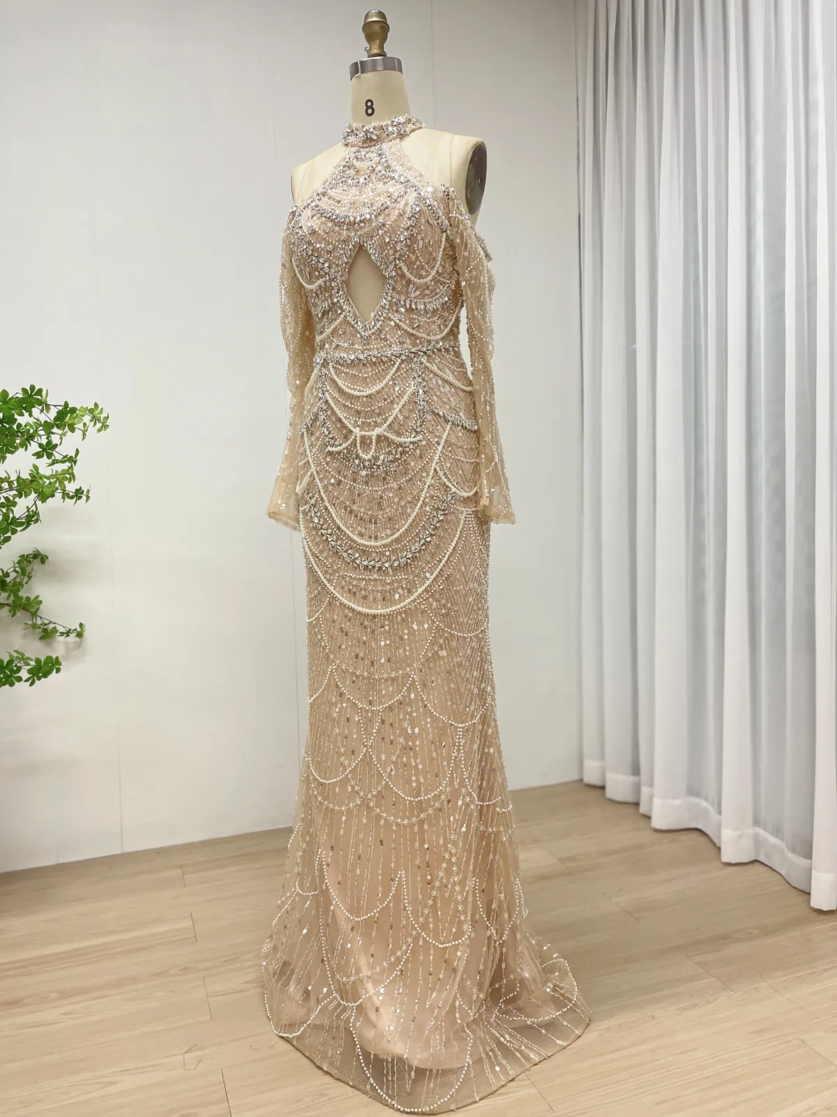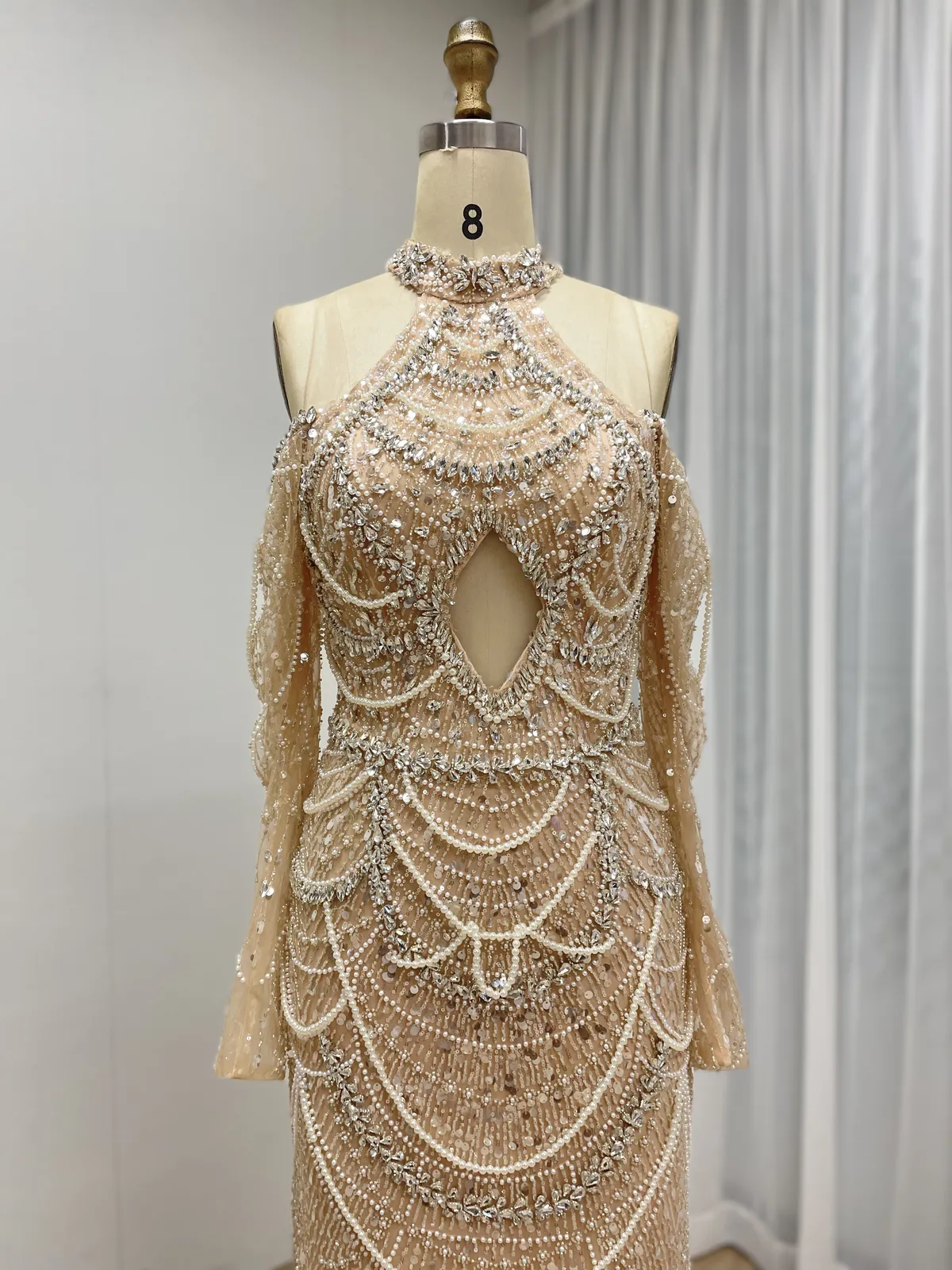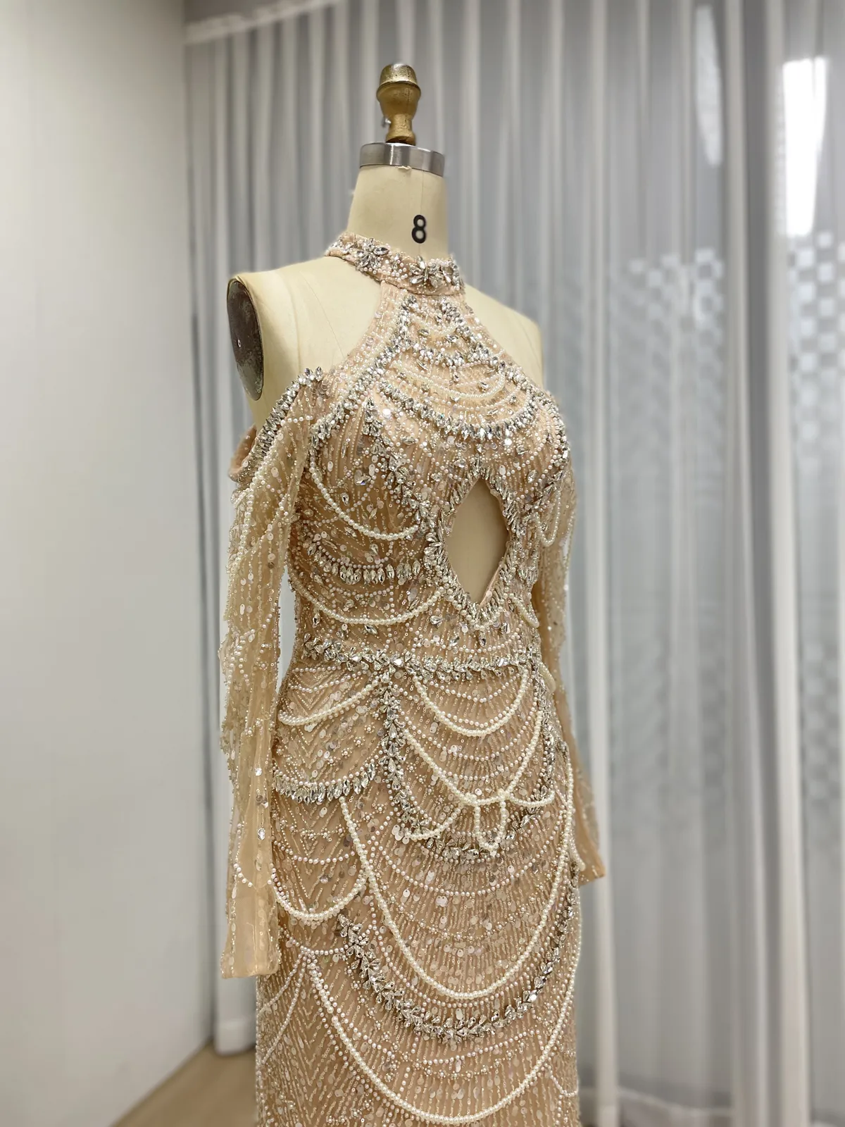 Champagne Halter Evening Gown with Crystal Pearl Swag & Cold-Shoulder Detail MY30218