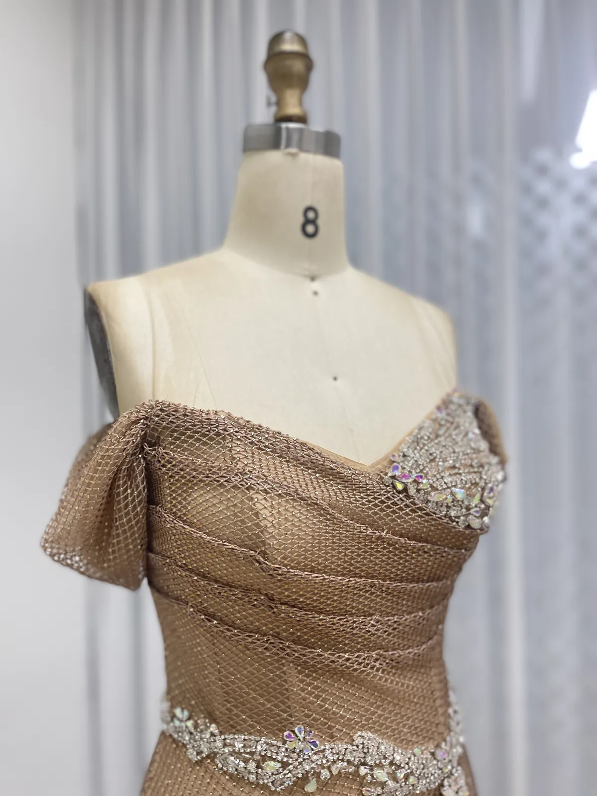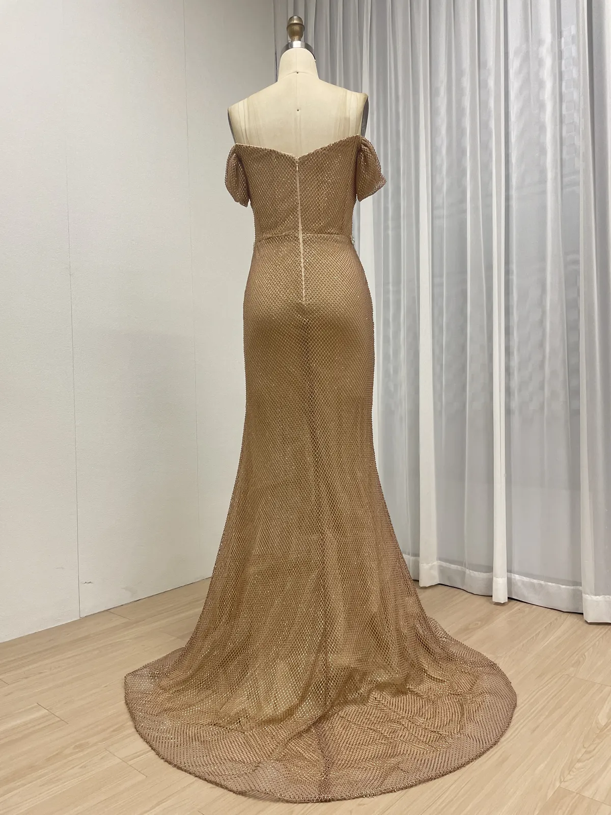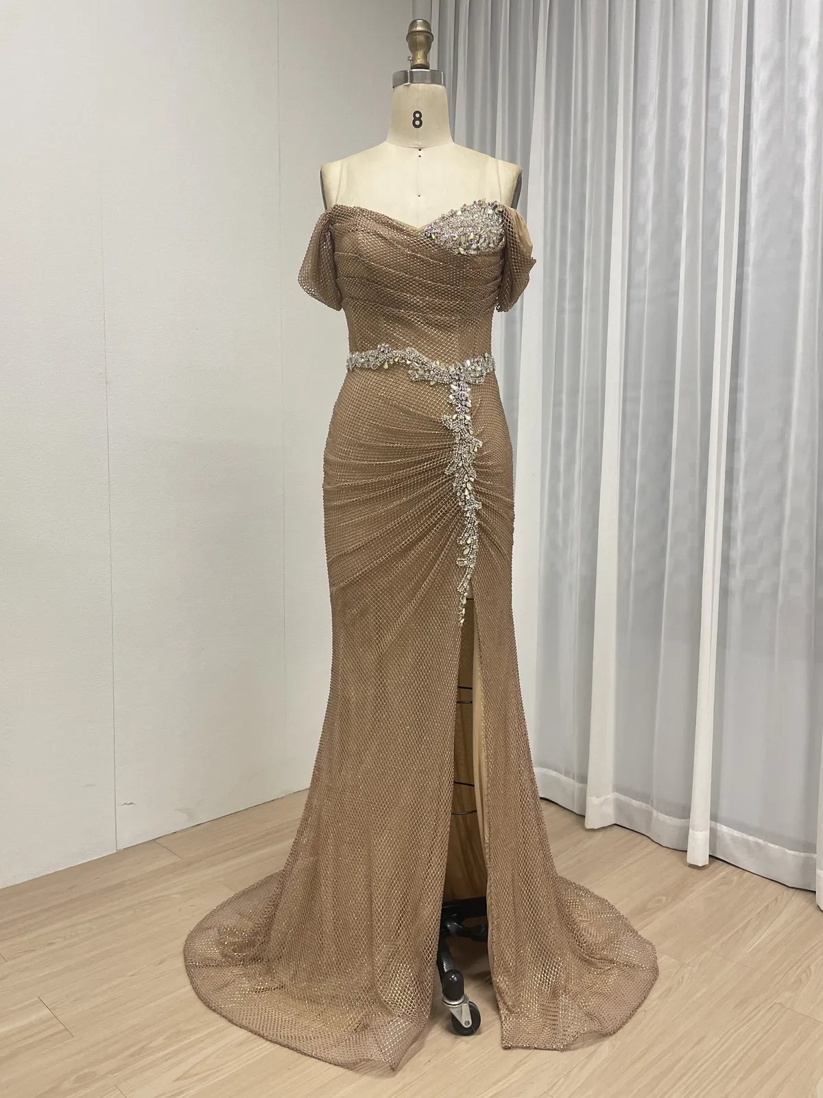 Elevate your evening wardrobe with this stunning brown evening dress, designed to make a lasting impression. The elegant silhouette features a daring side slit that adds a touch of allure, while the rich brown hue complements a variety of skin tones. Crafted from high-quality materials, this dress ensures both comfort and style, making it perfect for formal events or sophisticated gatherings. Step into the spotlight and embrace your confidence with this exquisite piece that effortlessly combines classic elegance with modern flair.
