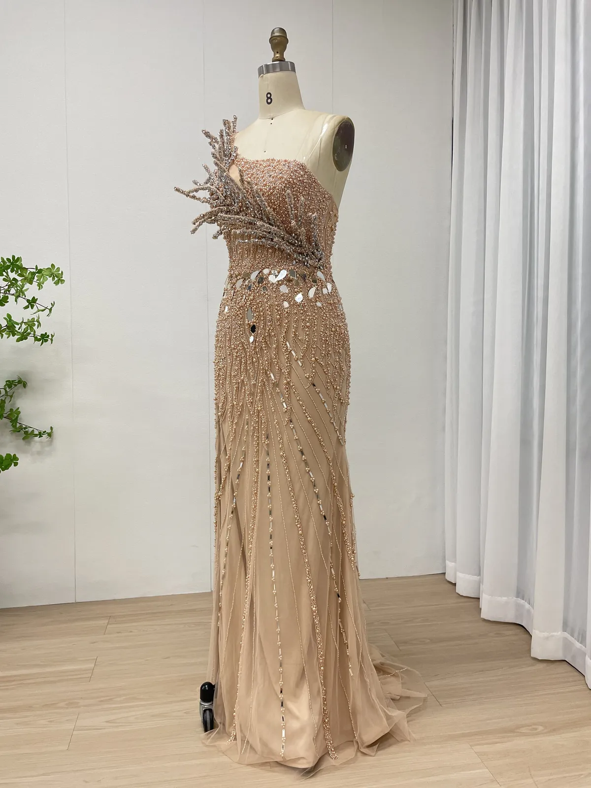 Make a high-fashion statement in this breathtaking, couture-inspired evening gown. This dress is a work of art, featuring a sleek, one-shoulder silhouette crafted from a stunning champagne-colored fabric covered in intricate, vertical strands of shimmering beads and sequins. The true showstopper is the dramatic, sculptural shoulder detail, which rises elegantly from the neckline with a unique, branch-like or feathered texture. The fitted bodice is cinched at the waist by a wide, beaded belt embellished with large, reflective mirror pieces, adding a modern touch of glamour. A daring high side slit completes the look, ensuring you make a memorable entrance.