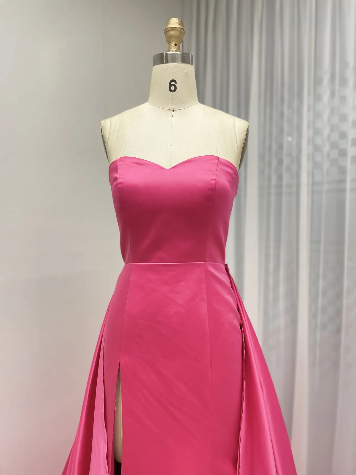 Make a bold and vibrant statement in this stunning fuchsia satin gown. The dress features a classic strapless sweetheart neckline and a sleek, fitted bodice. A luxurious, floor-length overlay skirt is draped elegantly over the main skirt, creating a sophisticated and flowing silhouette with a high side slit. The rich satin fabric and vibrant color give this gown a glamorous and modern feel, perfect for making a memorable entrance at a prom, a formal evening event, or a black-tie gala.