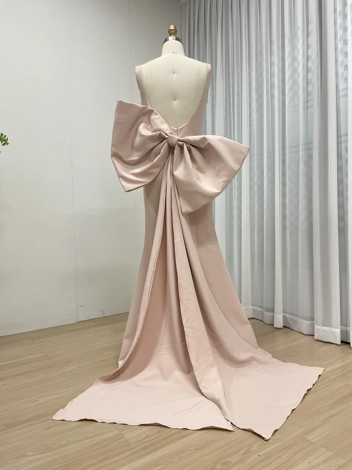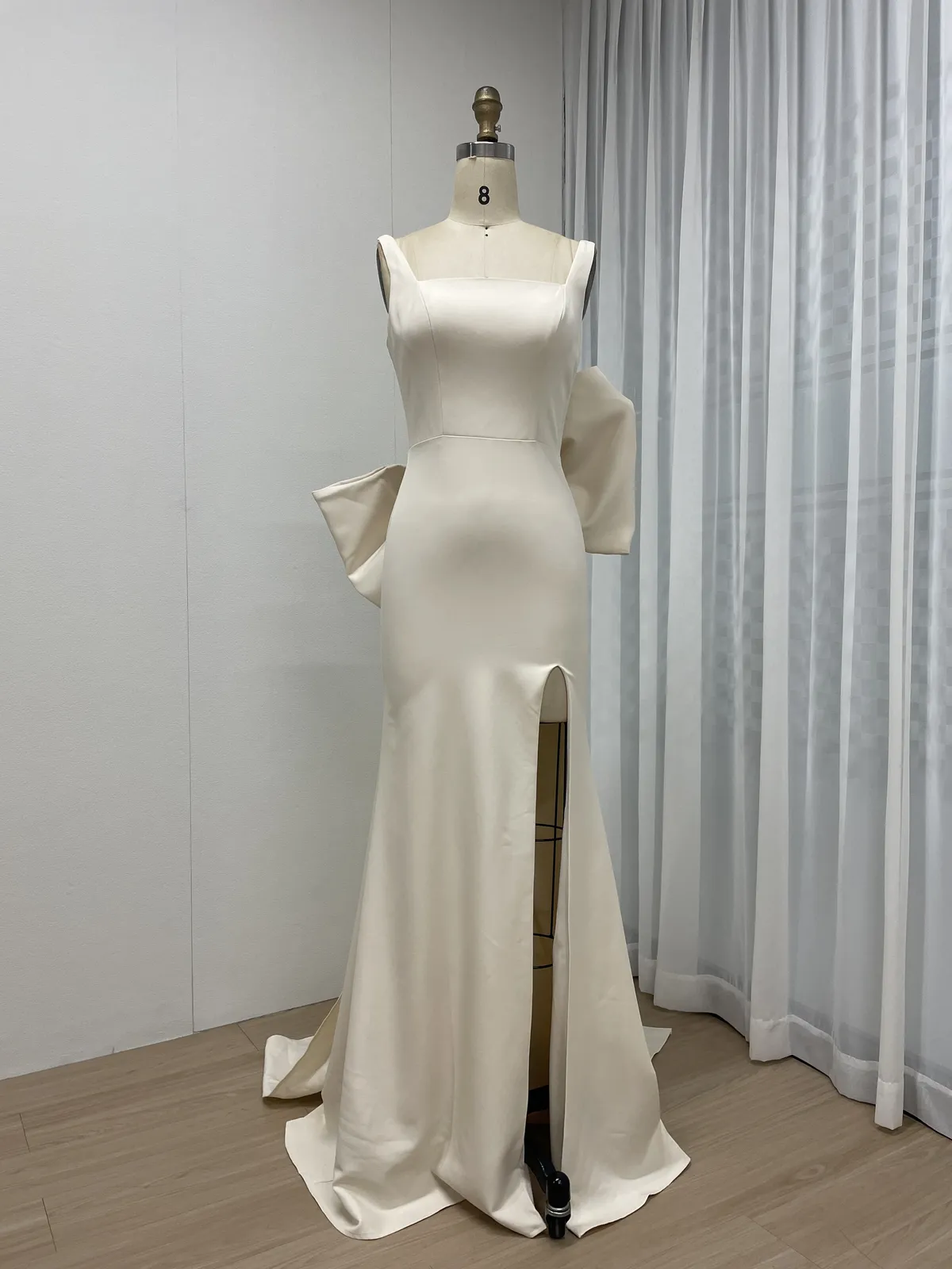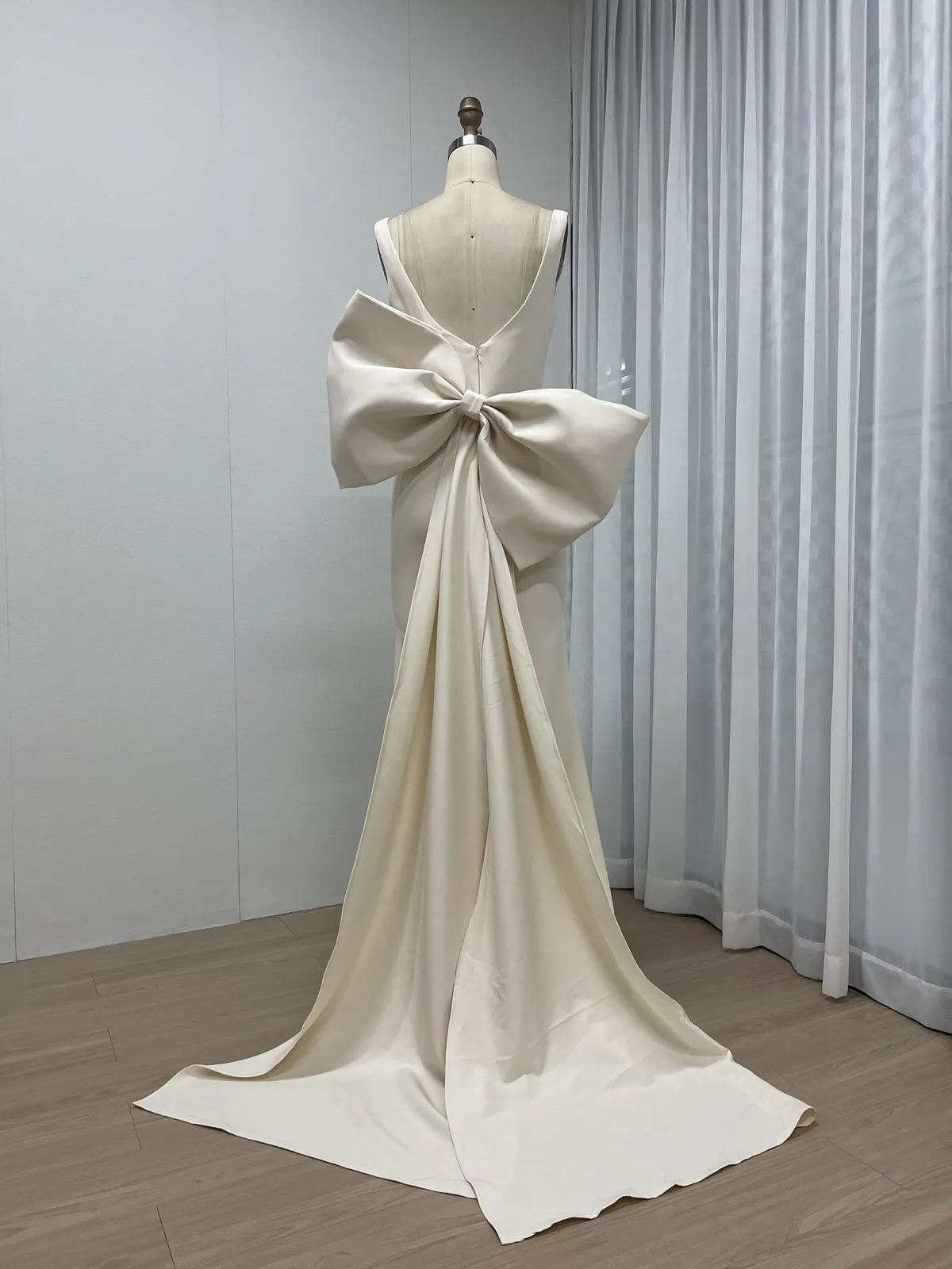 The true highlight of this gown is the magnificent oversized bow that adorns the back. This structural and elegant detail adds a high-fashion, architectural element, creating a memorable and glamorous exit. A subtle train flows from the bow, completing the look with a touch of classic formalwear. This dress is perfect for a modern bride, a black-tie gala, or any event where you want to be the center of attention.