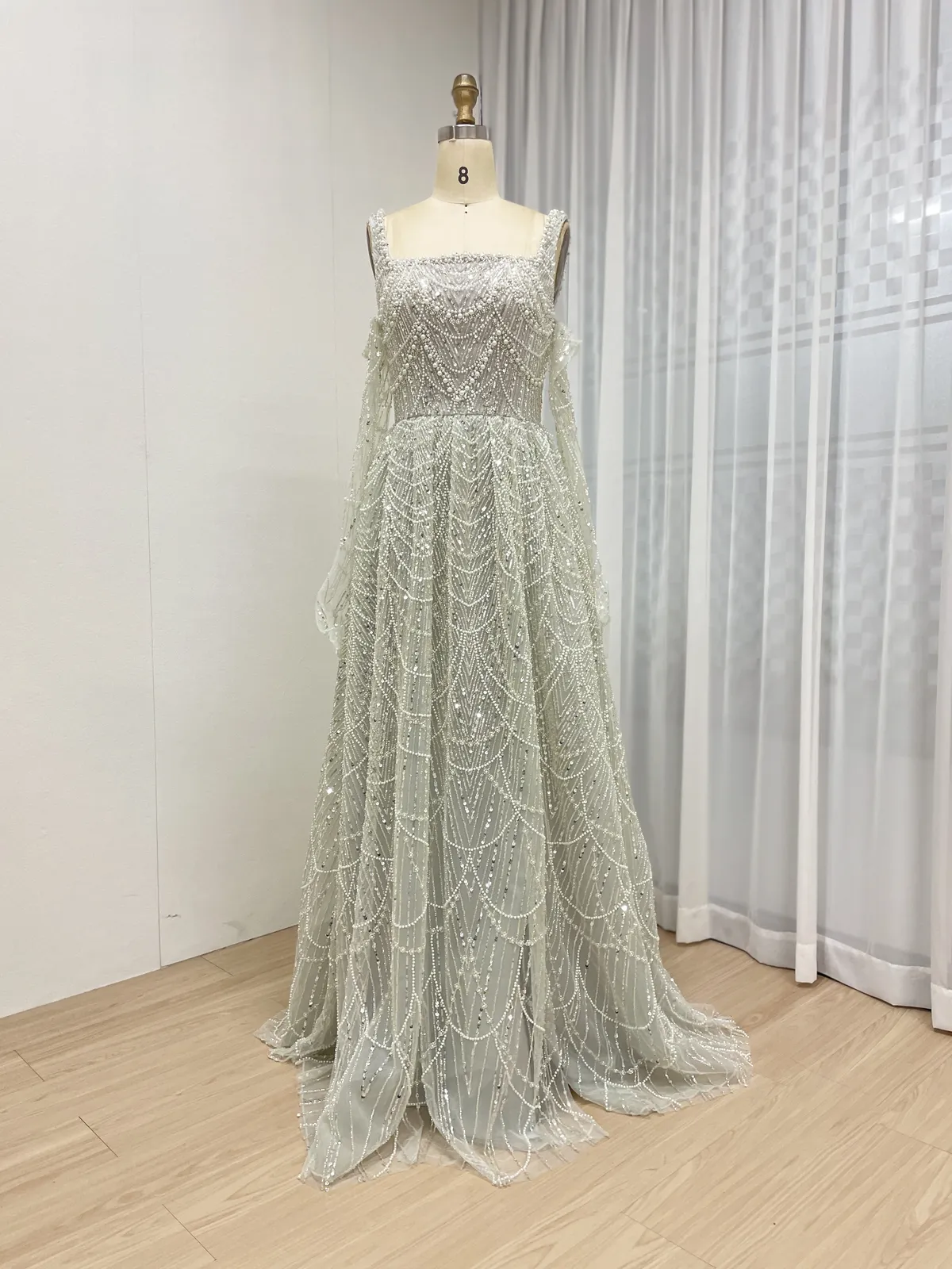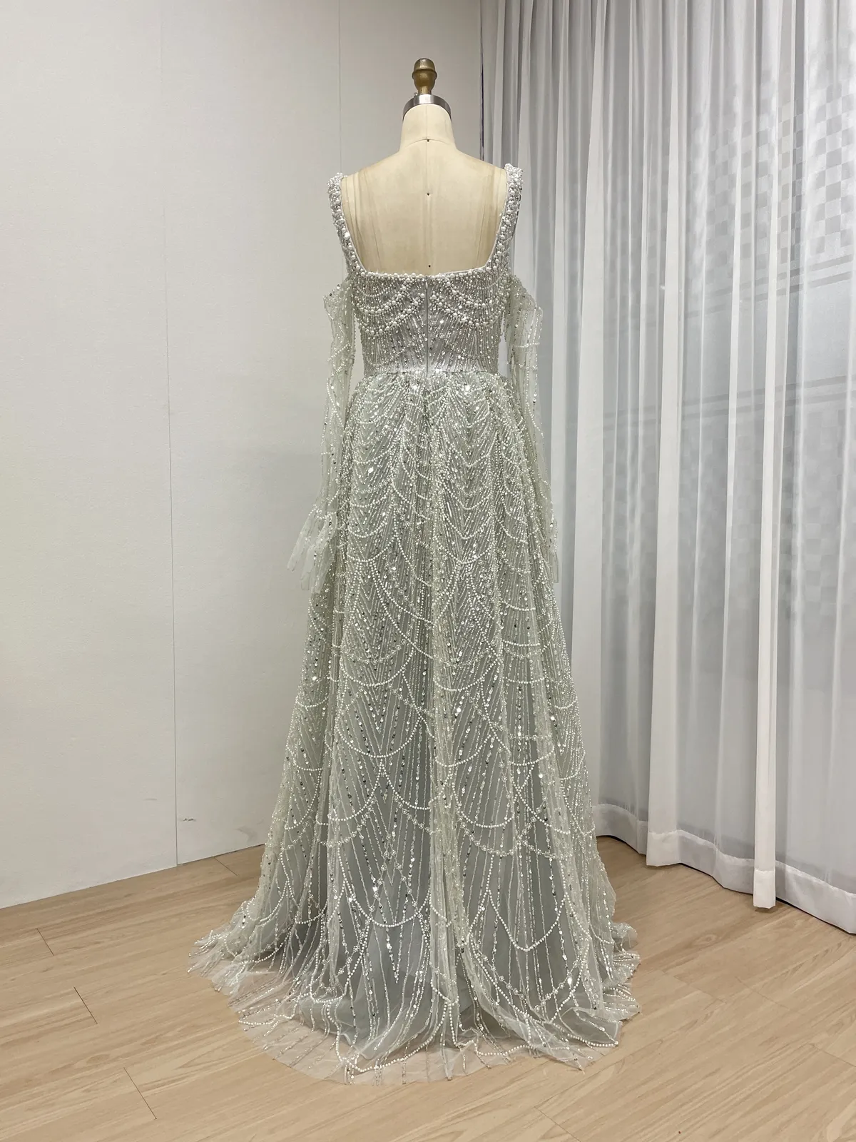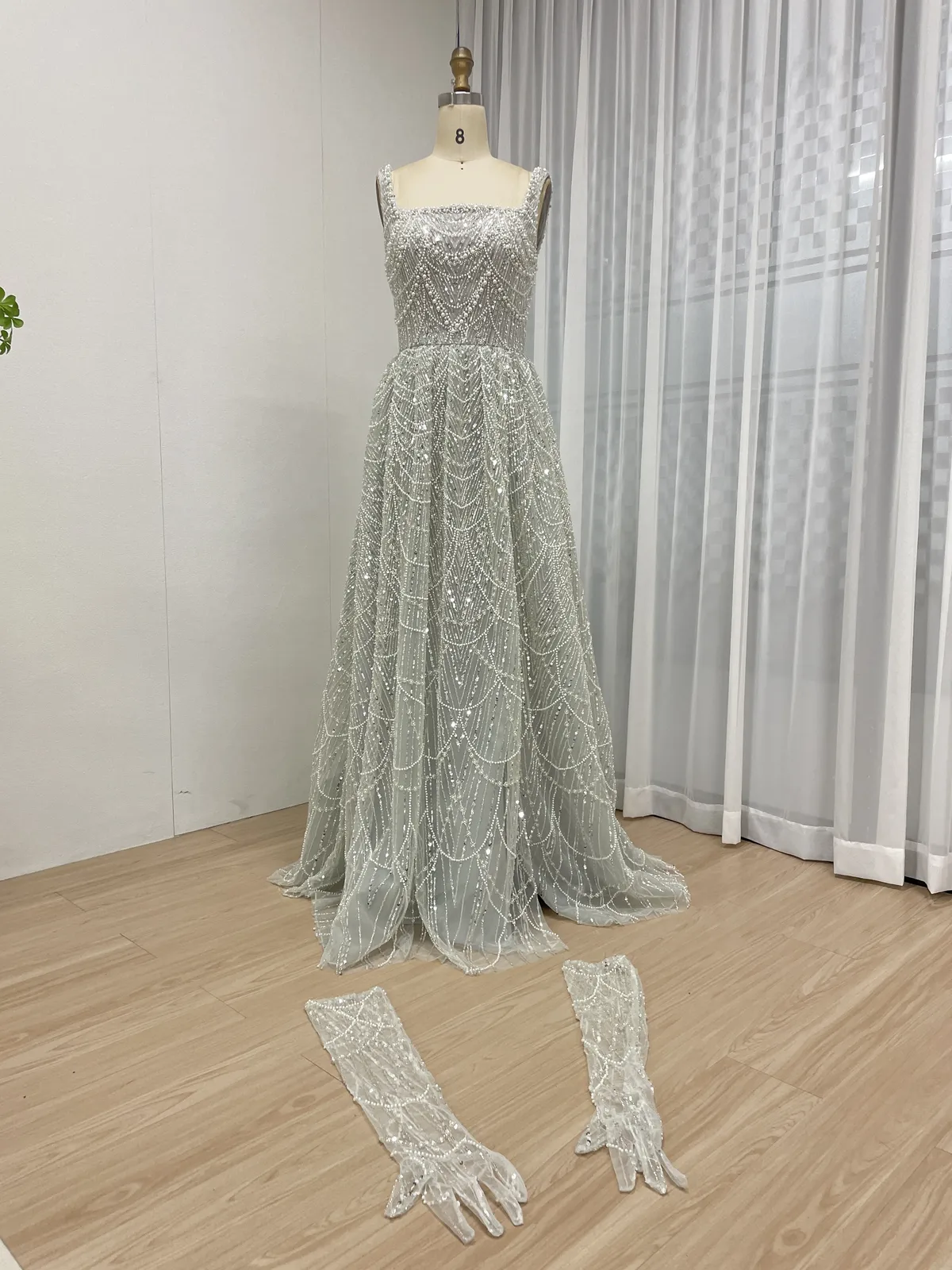 Elegant Beaded A-Line Gown with Square Neckline and Matching Gloves MY30142