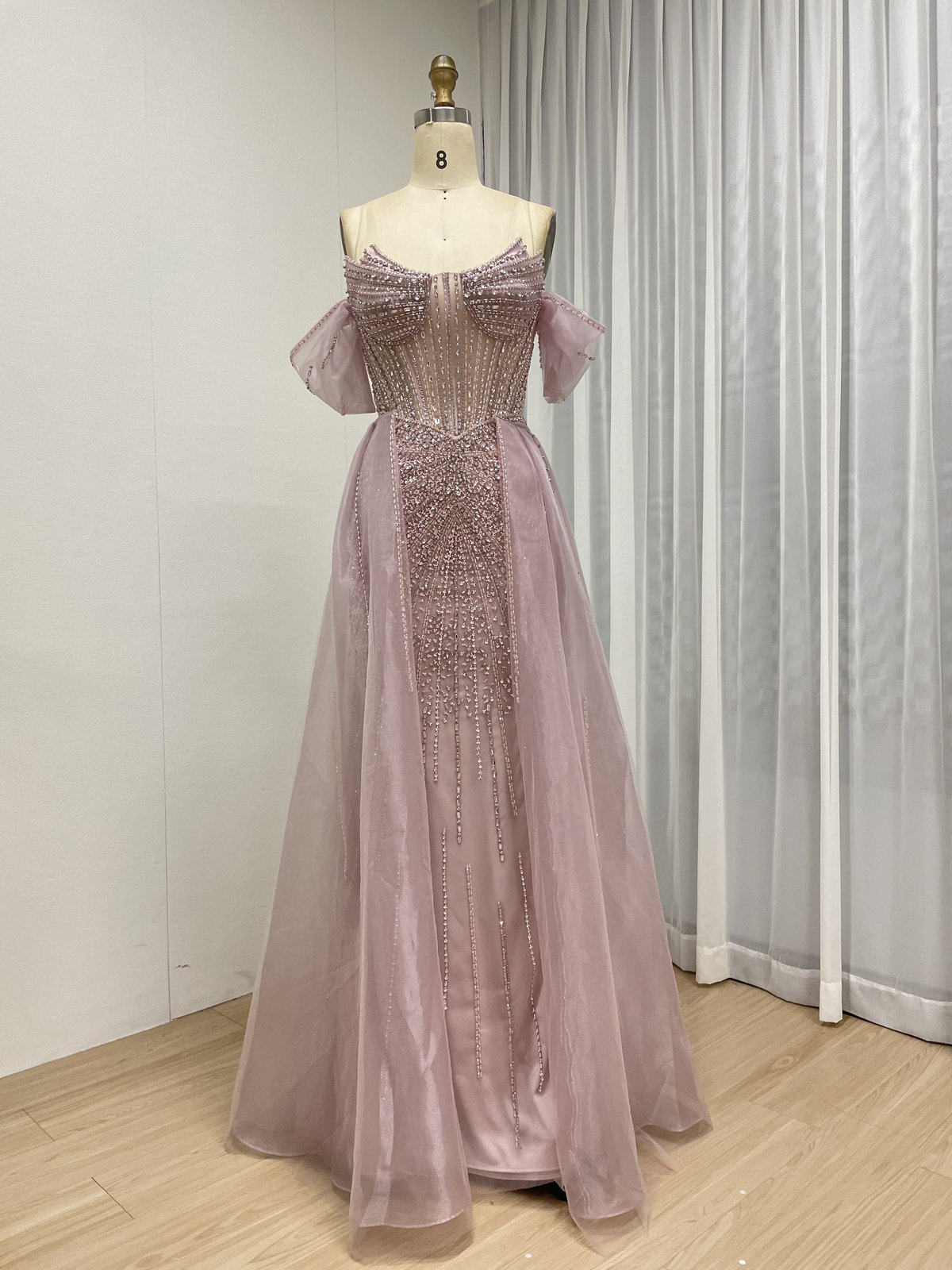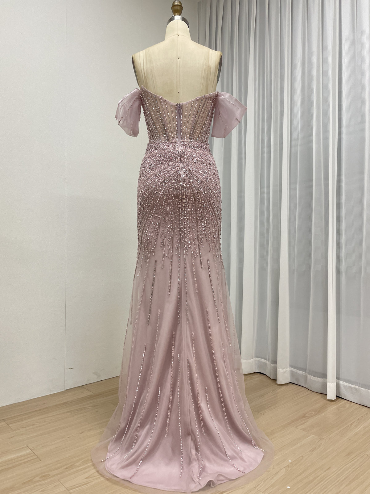 This gown features a delicate off-the-shoulder design, enhancing your neckline while the intricate beading adds a touch of glamour. Perfect for galas, weddings, or any special occasion, it’s a versatile addition to your wardrobe. Pair it with simple accessories to let the dress shine.