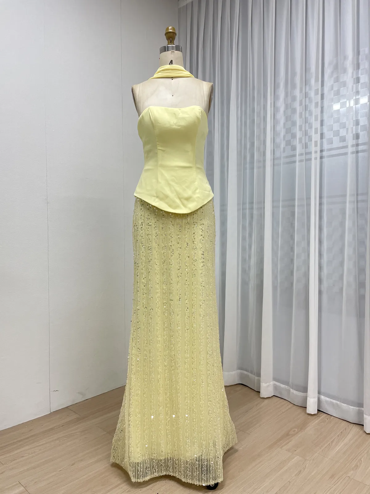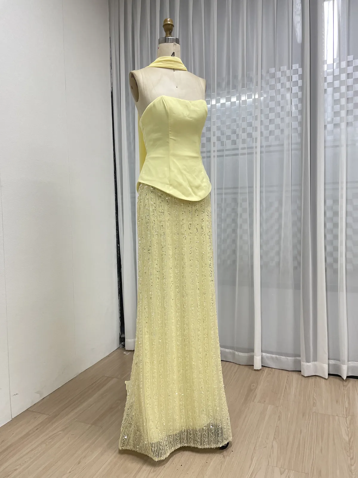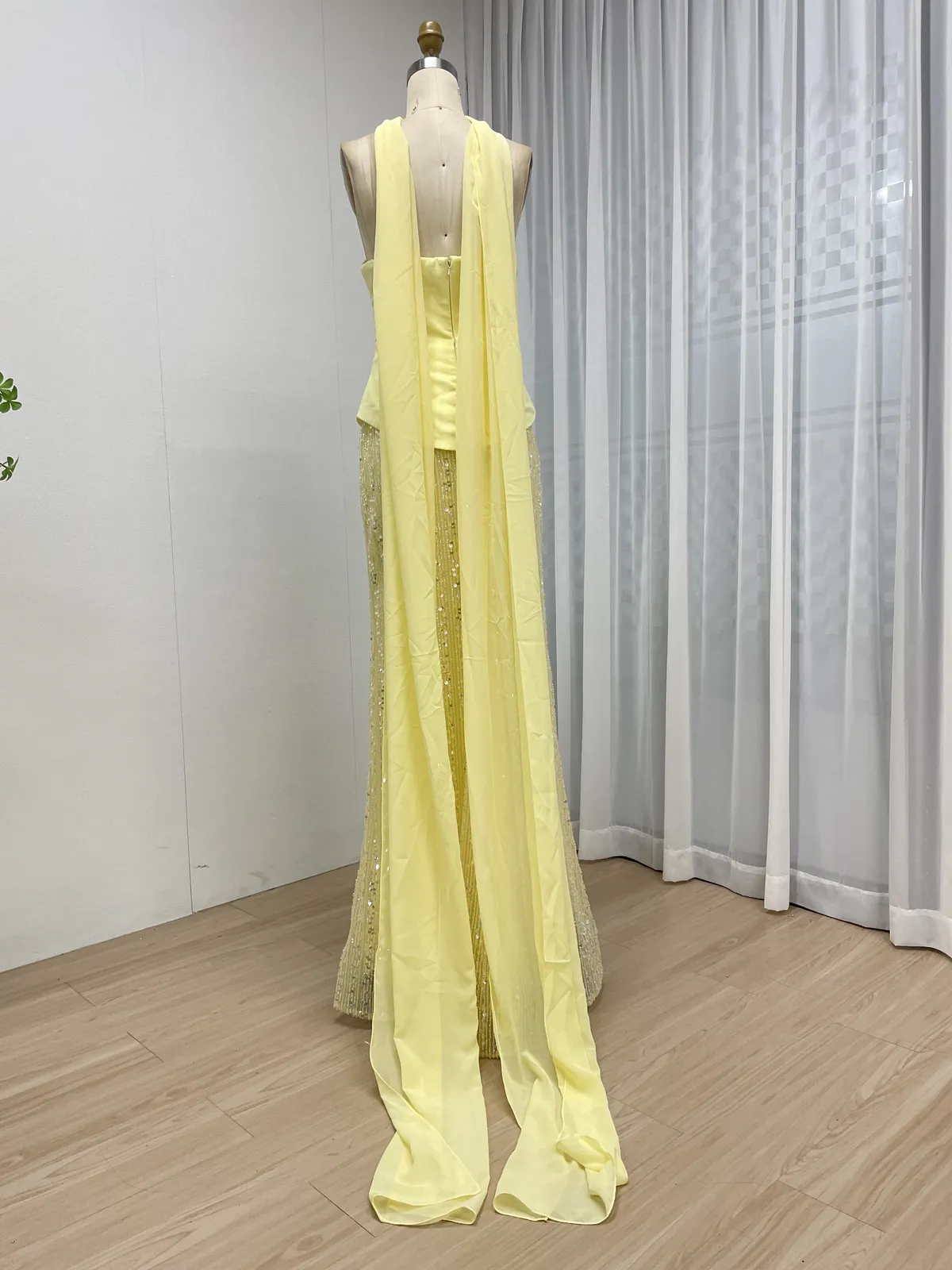 Elegant Yellow Strapless Mermaid Evening Gown with Sequin Skirt and Long Back Scarf Train MY30200