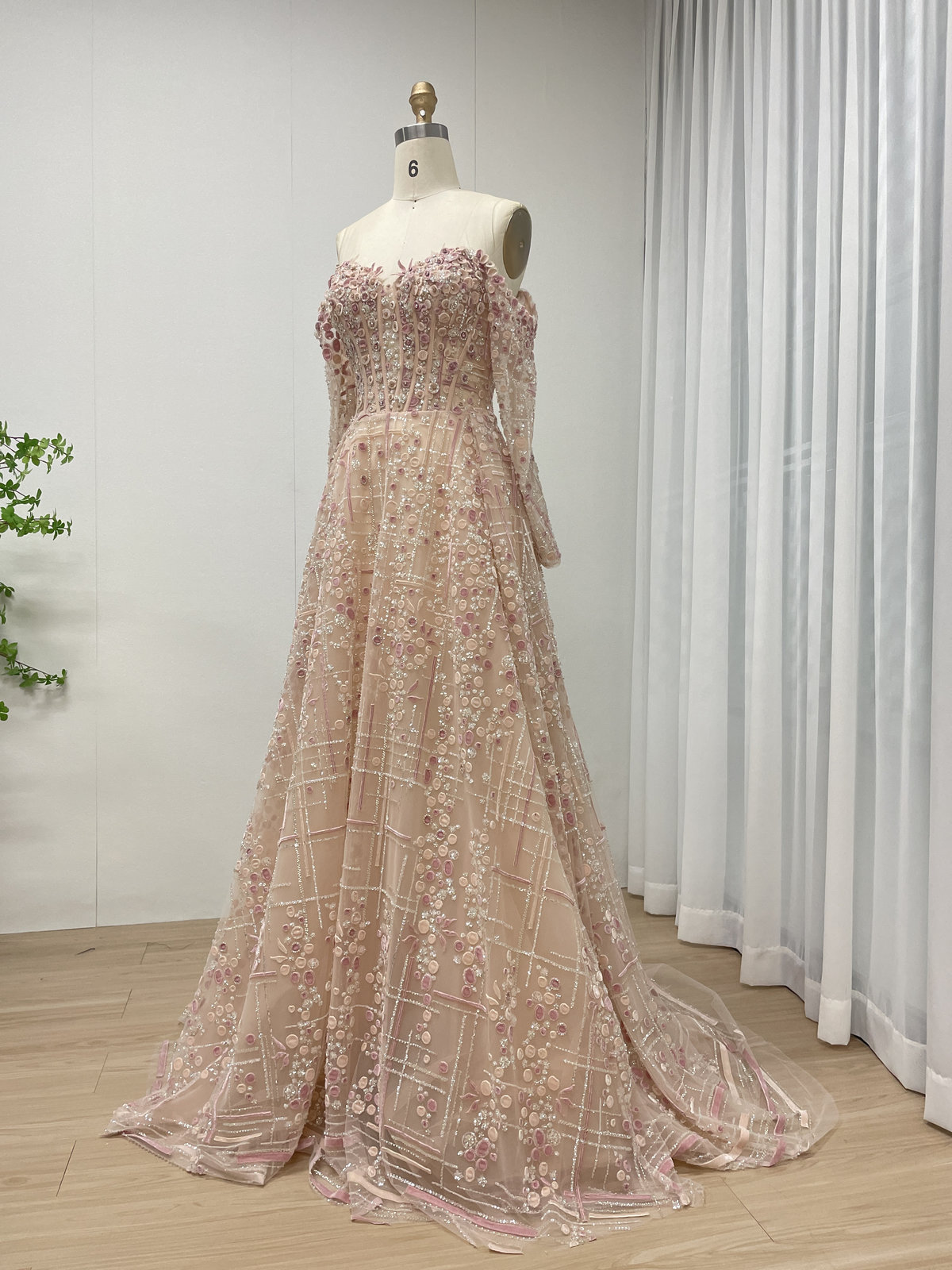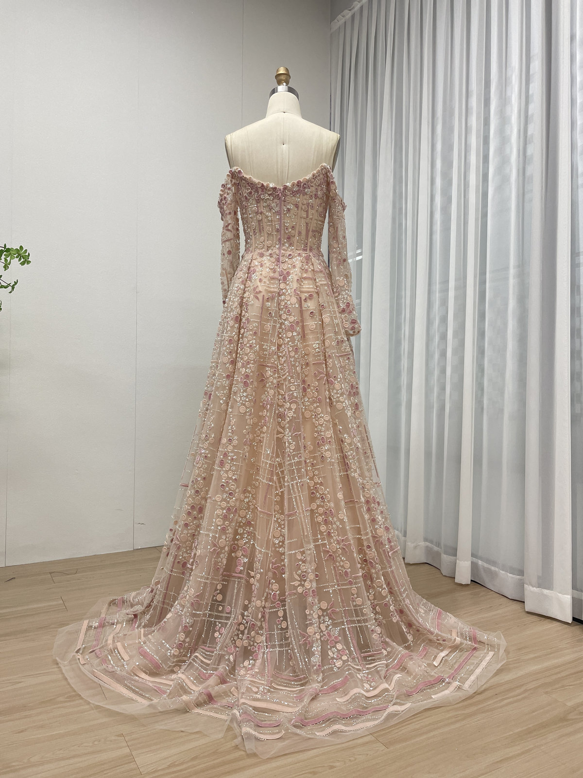 Step into a whimsical garden fairytale with this enchanting blush-toned evening gown. The dress features a romantic off-the-shoulder neckline with delicate, draped straps and elegant long sleeves, all crafted from sheer, intricately embroidered tulle. The entire gown is a masterpiece of design, adorned with a captivating pattern of floral and geometric embroidery in shades of pink, white, and silver. The A-line silhouette flows gracefully from a structured bodice into a full, ethereal skirt, creating a soft and dreamy movement. This gown is perfect for a formal garden wedding, a romantic gala, or any special occasion where you want to exude sophisticated charm and a touch of fantasy.