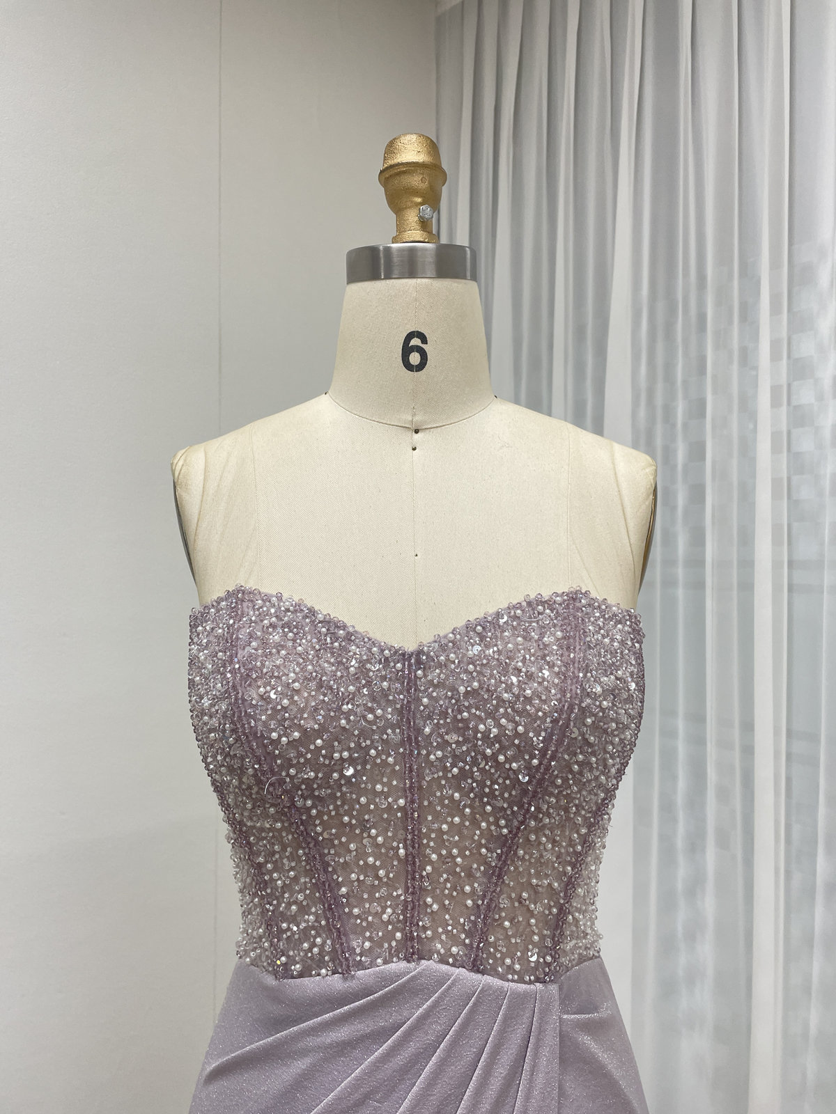 Step into the spotlight with this elegant and beautifully designed blush gown. The dress features a fitted, strapless bodice that is a masterpiece of intricate beading, with a dazzling, all-over art deco-inspired pattern.