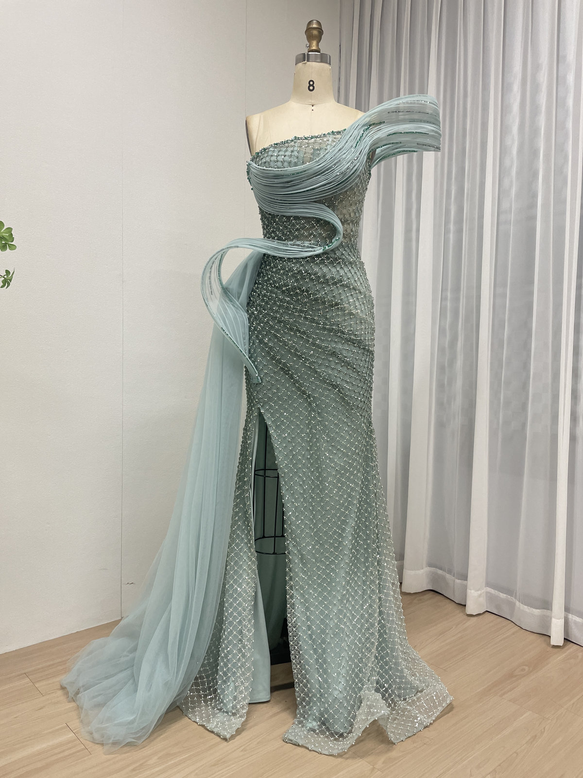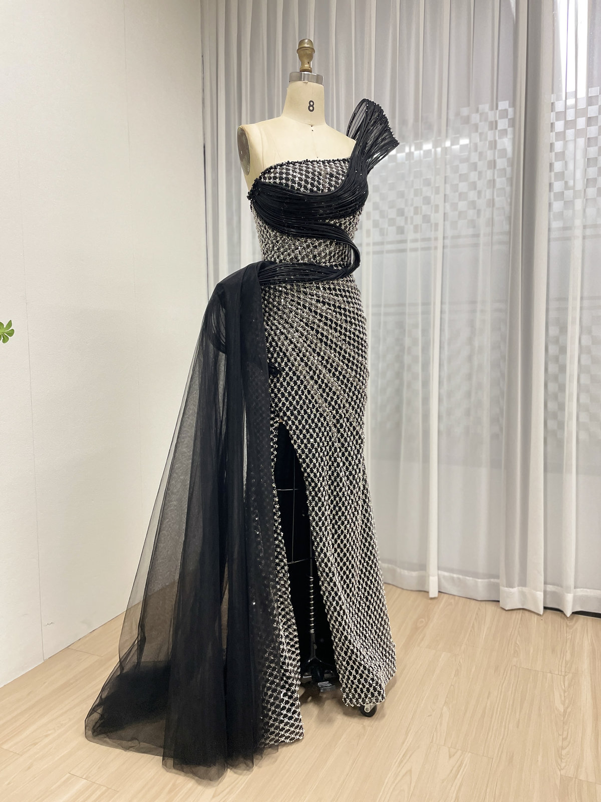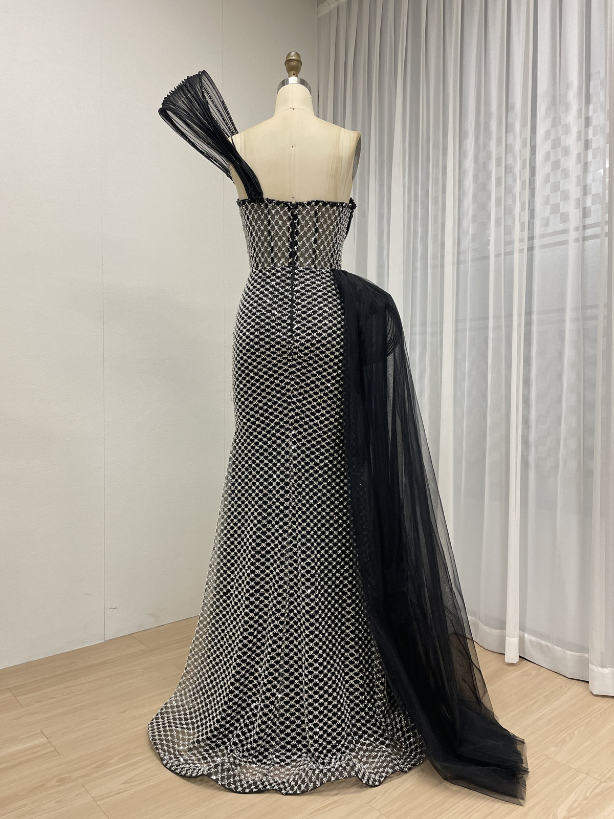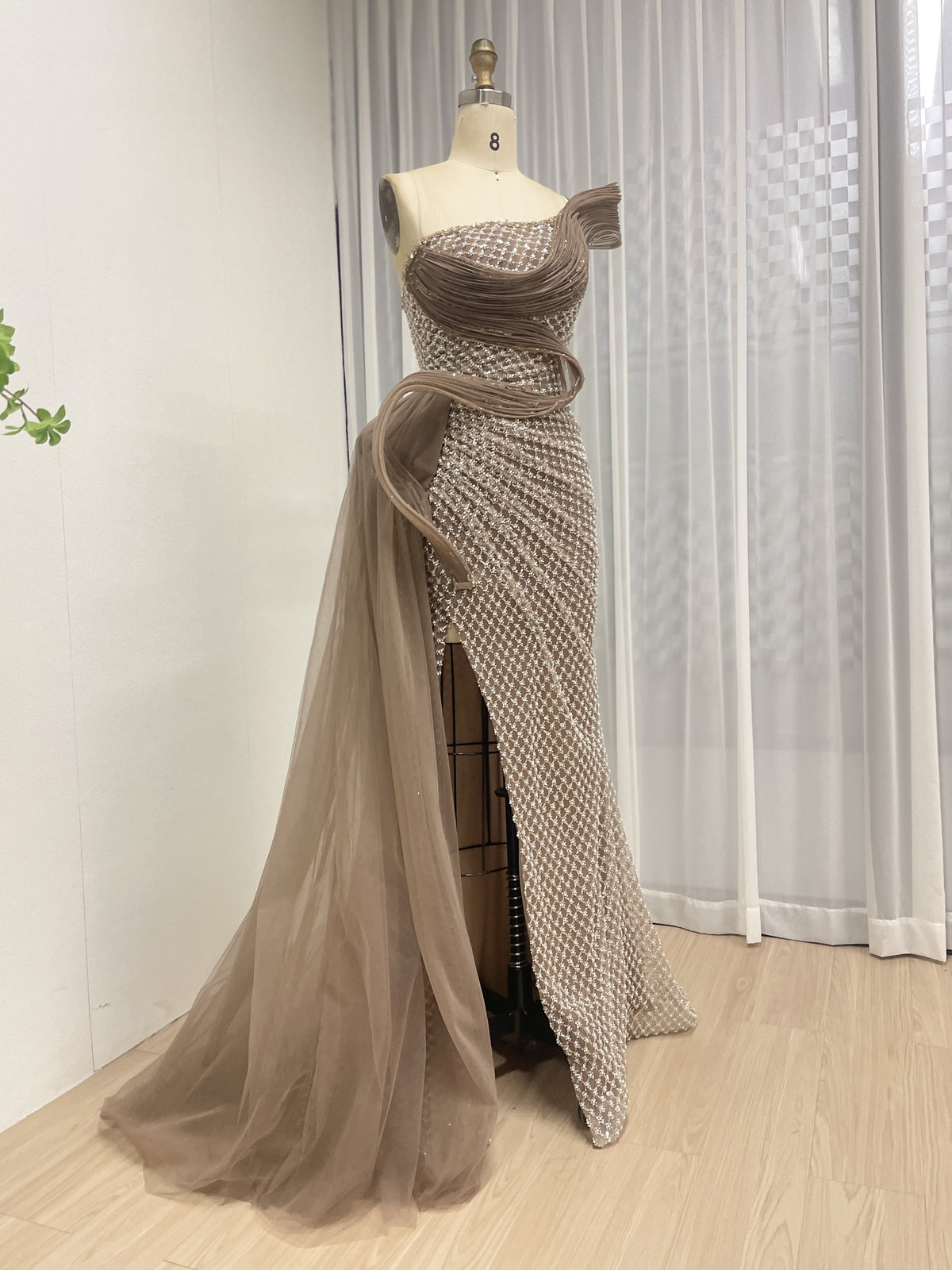 This elegant gown is a true statement piece, designed to make you sparkle from every angle. The dress features a classic strapless sweetheart neckline and a form-fitting bodice that is meticulously covered in an intricate pattern of dazzling beads and sequins.