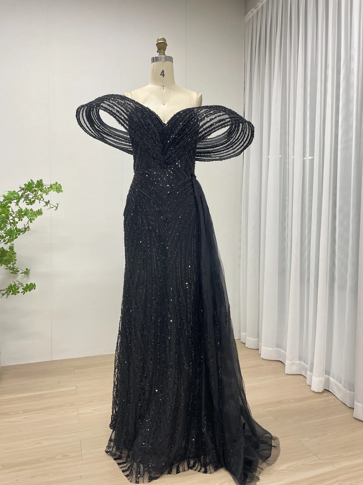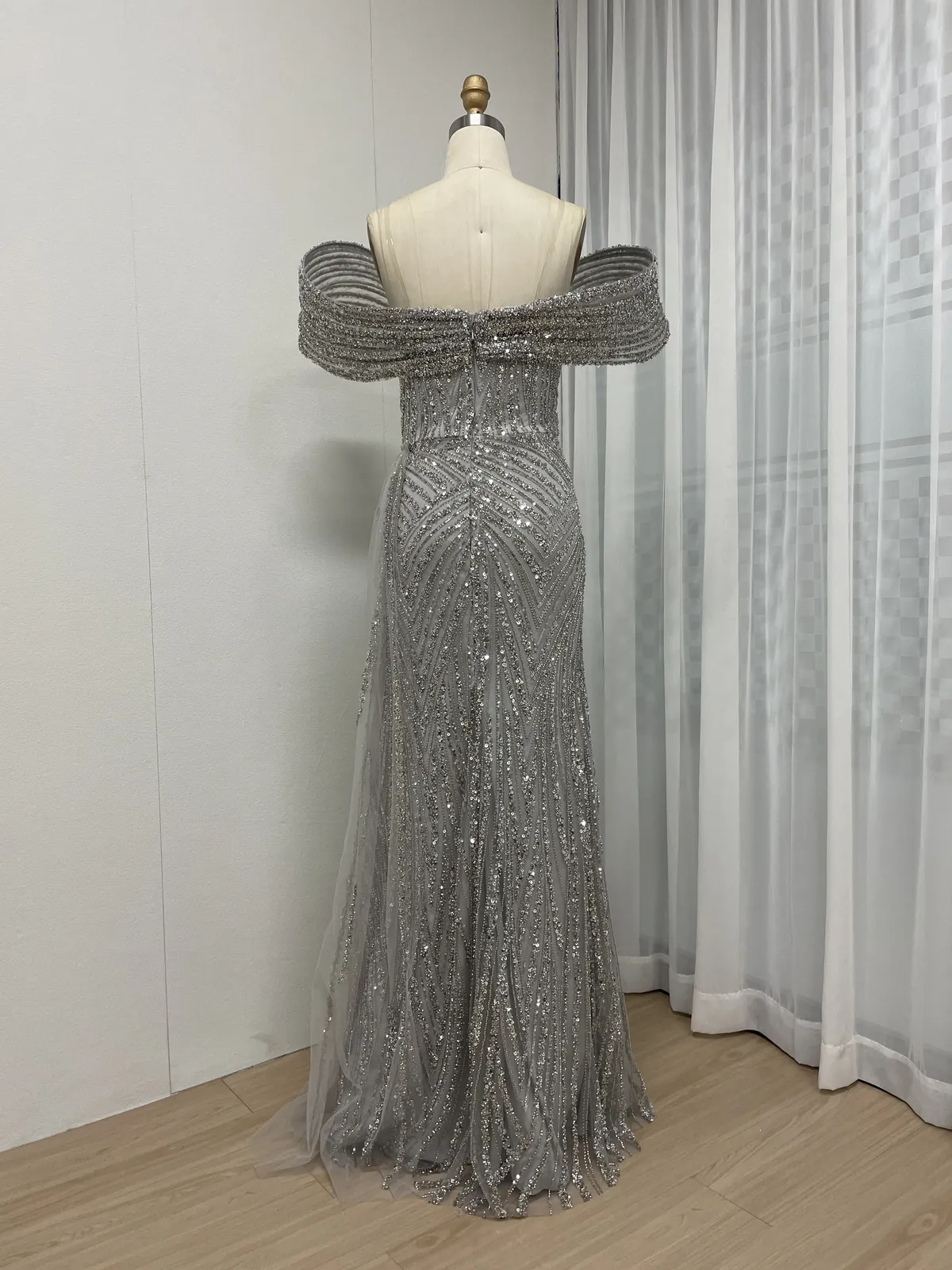 The defining feature of this gown is its unique off-the-shoulder design, featuring artfully draped sequined fabric that creates a dramatic and stylish look. This detail beautifully frames the shoulders and décolletage, adding a contemporary twist to a classic silhouette. Crafted for special occasions, this gown is perfect for formal events, galas, proms, and any evening where making a memorable entrance is key.