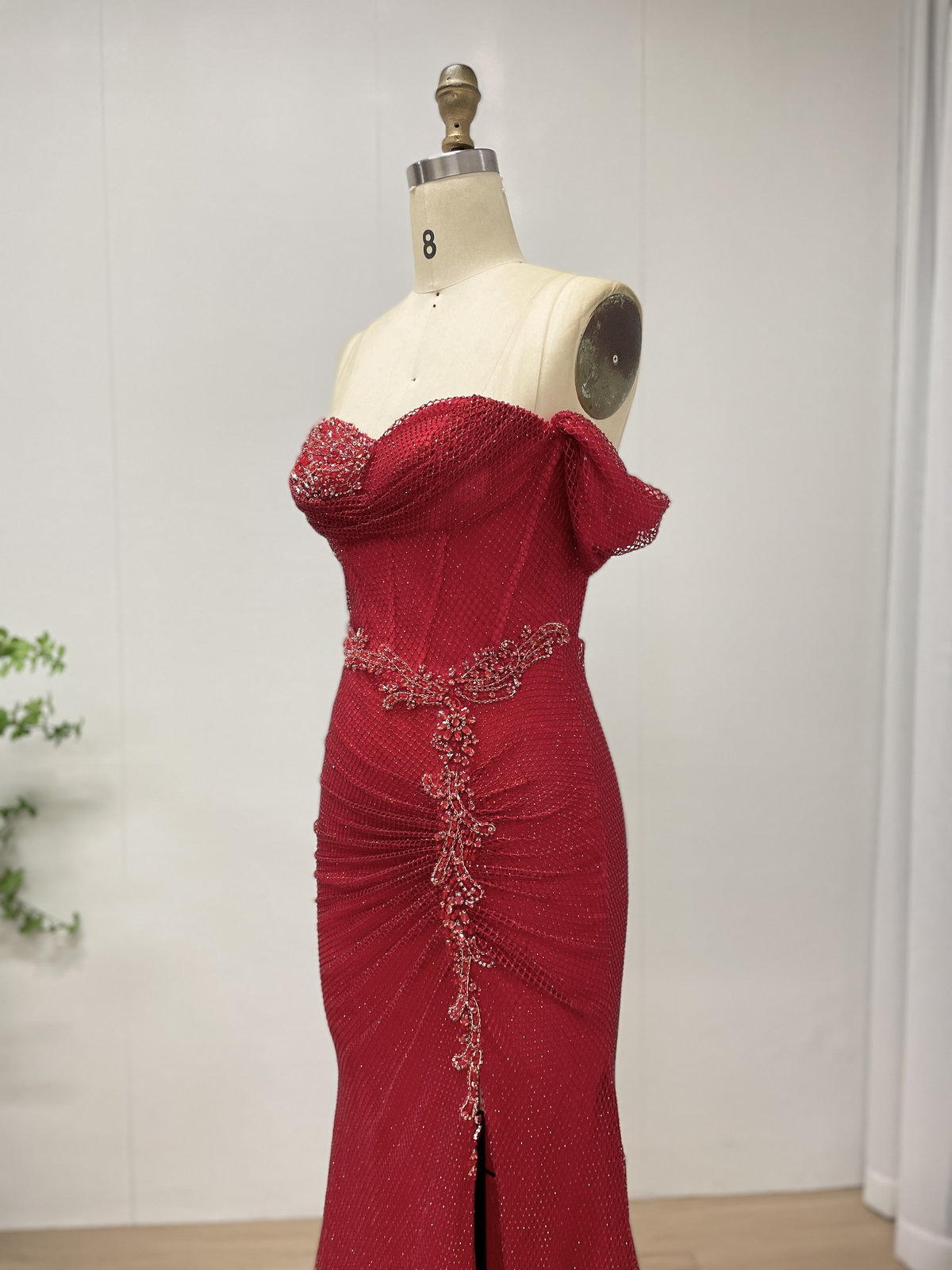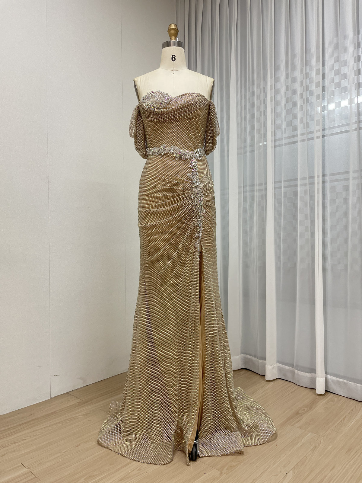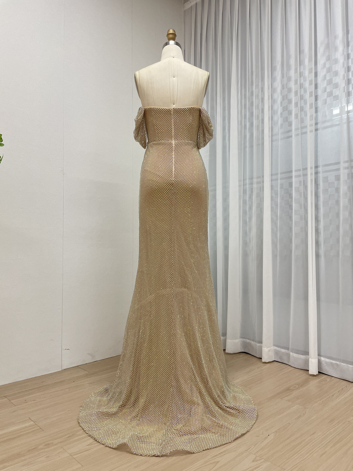 Golden Dazzling Off Shoulder Elegance Mermaid Gown With Split MB40437