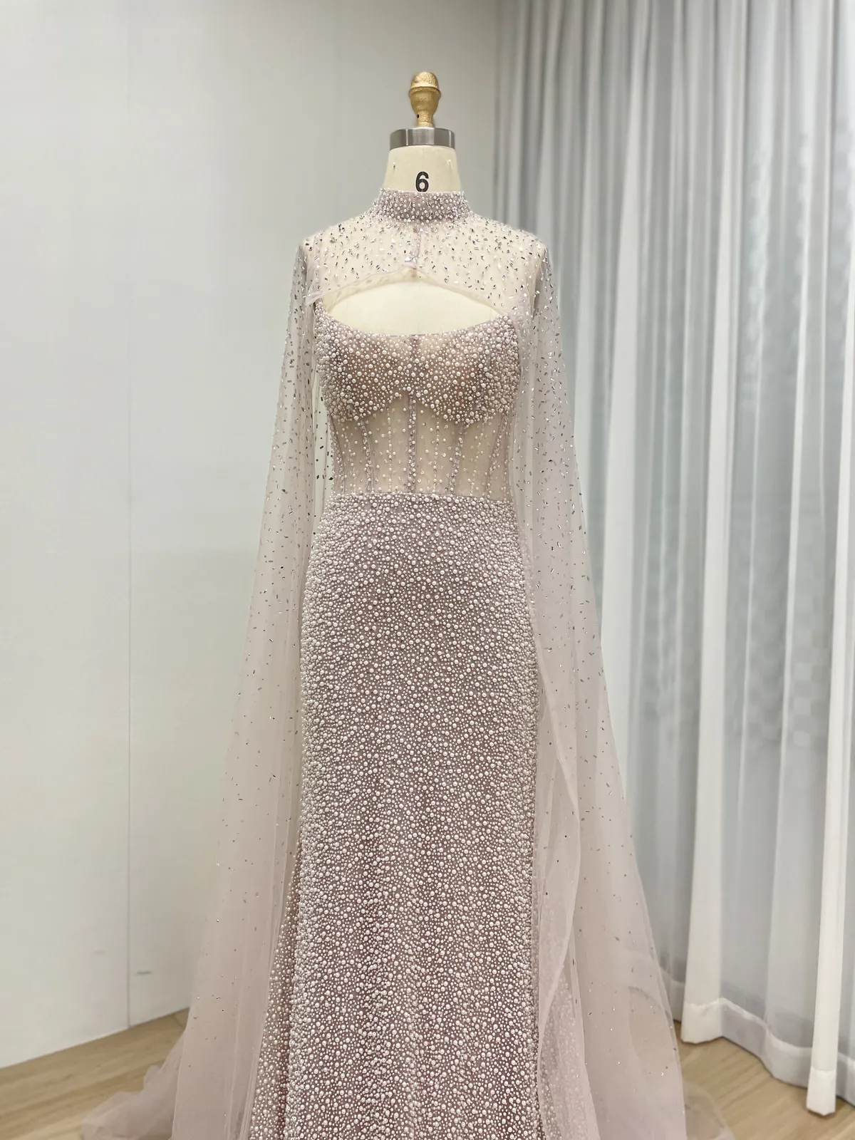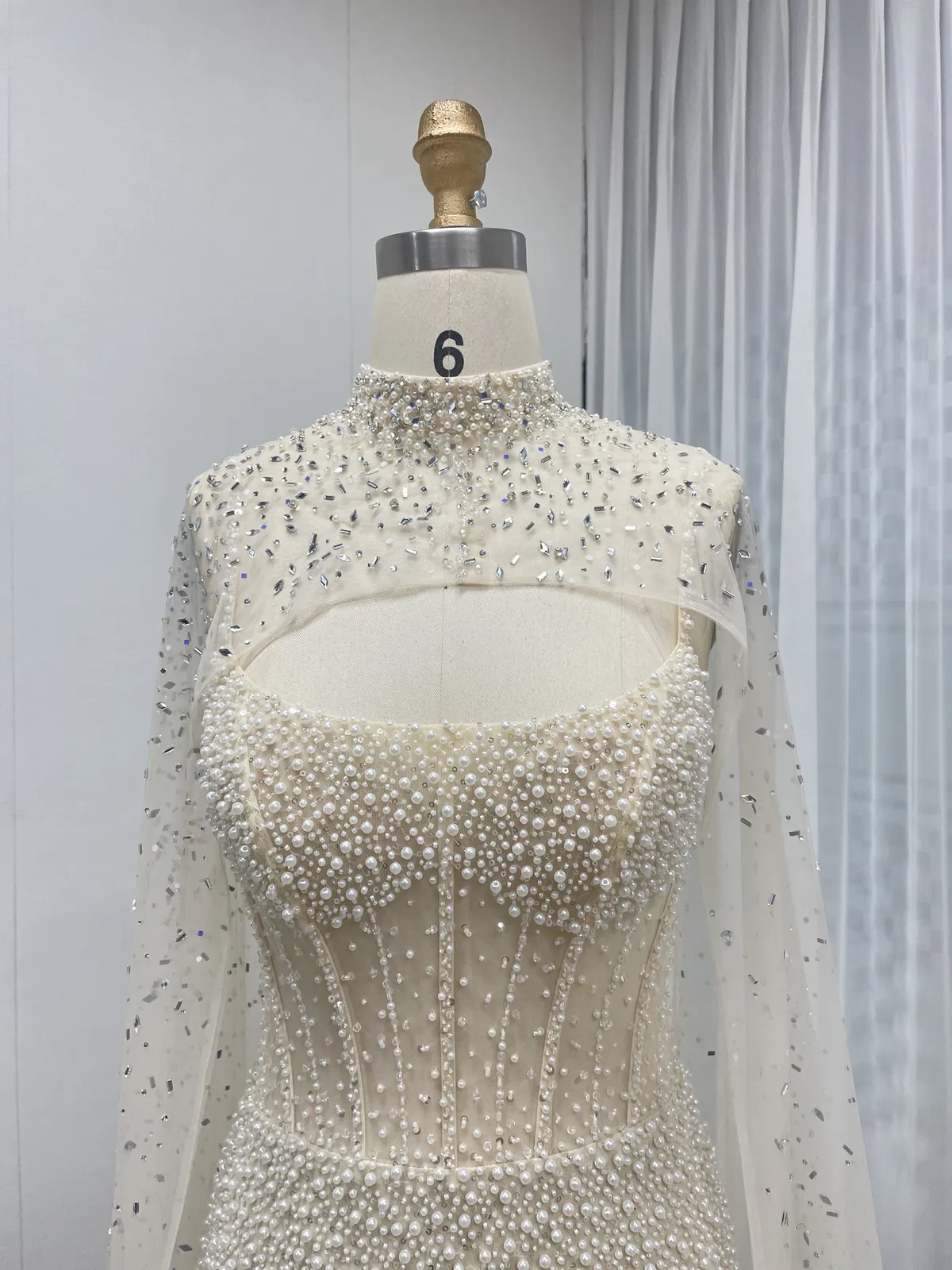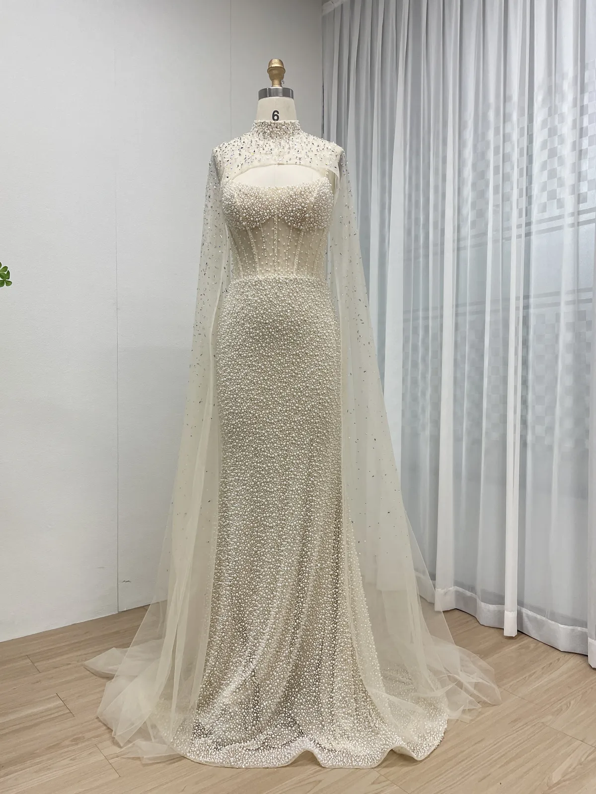 Ivory Pearl Beaded Mermaid Evening Dress with Detachable Sheer High-Neck Cape MB40312
