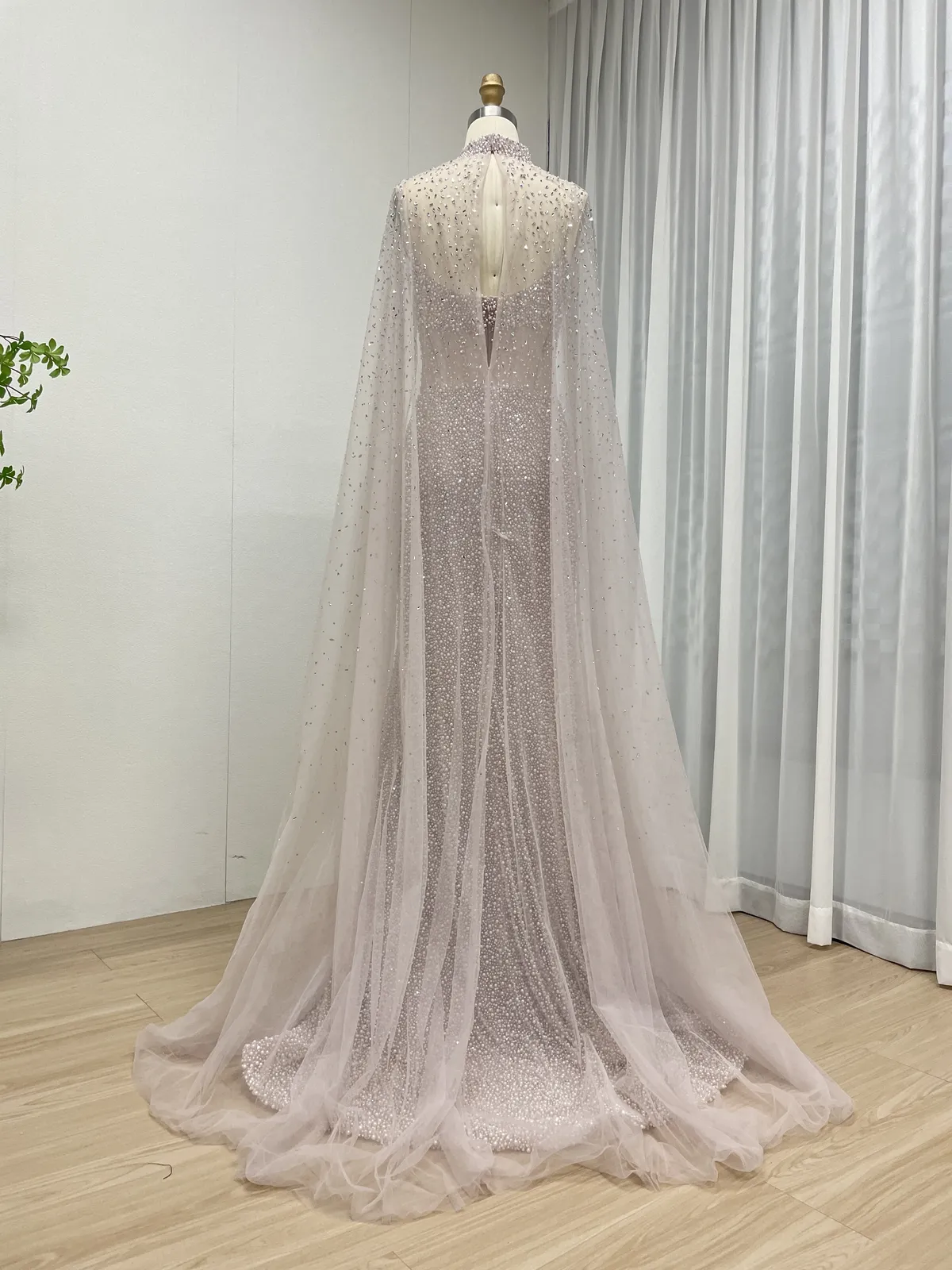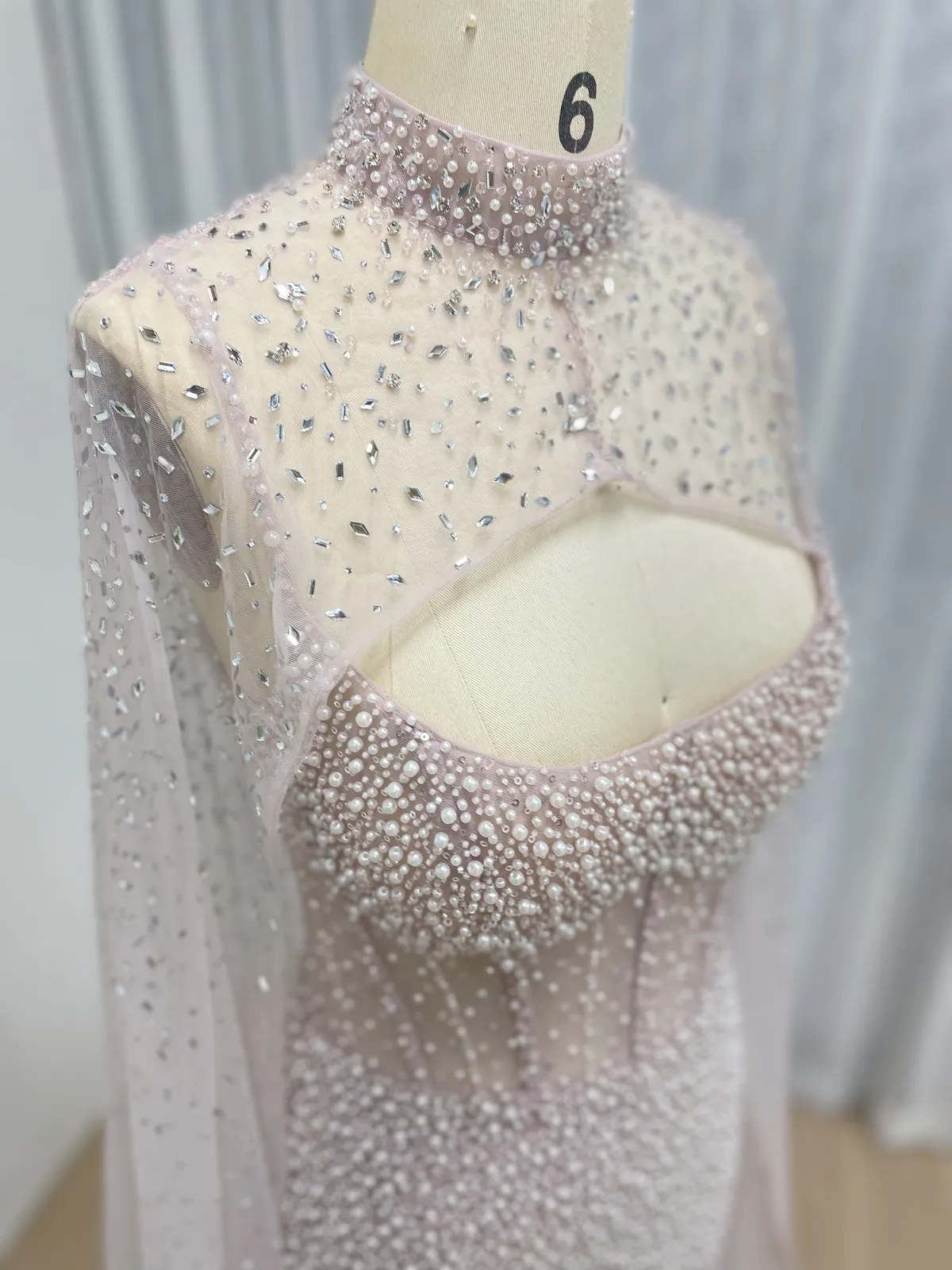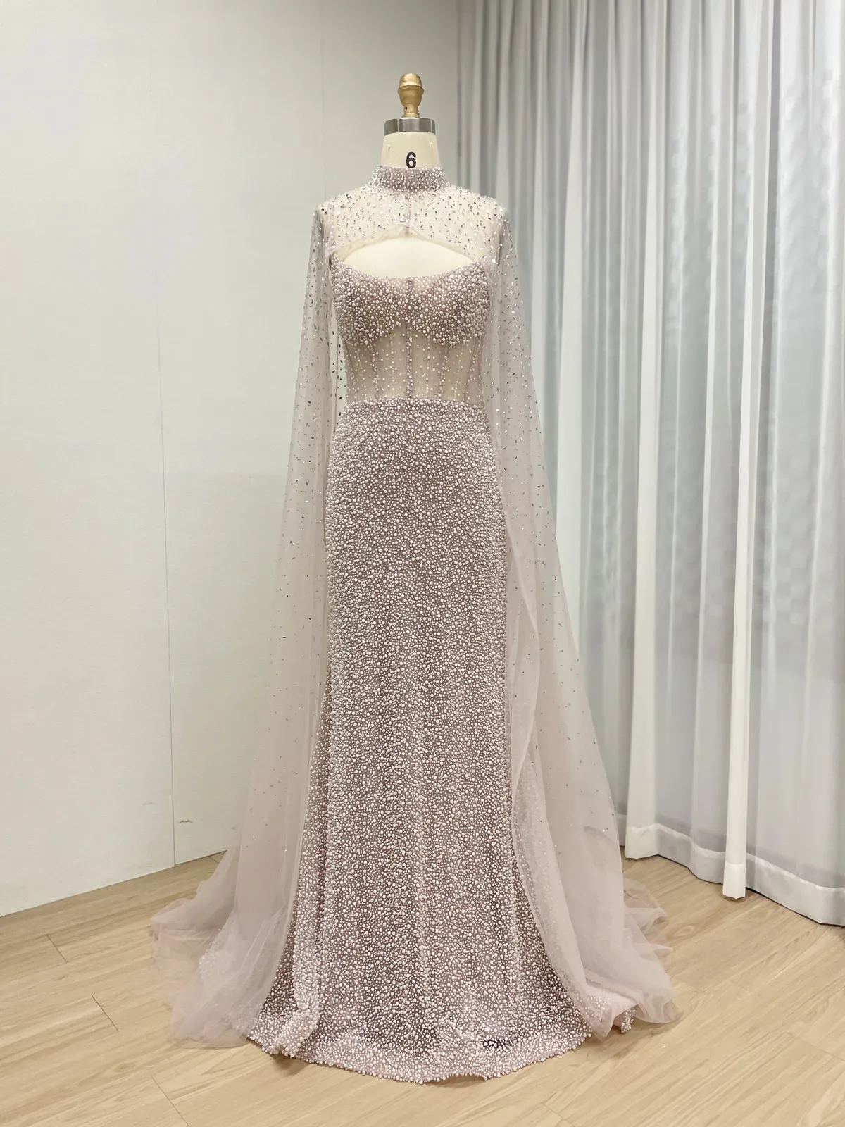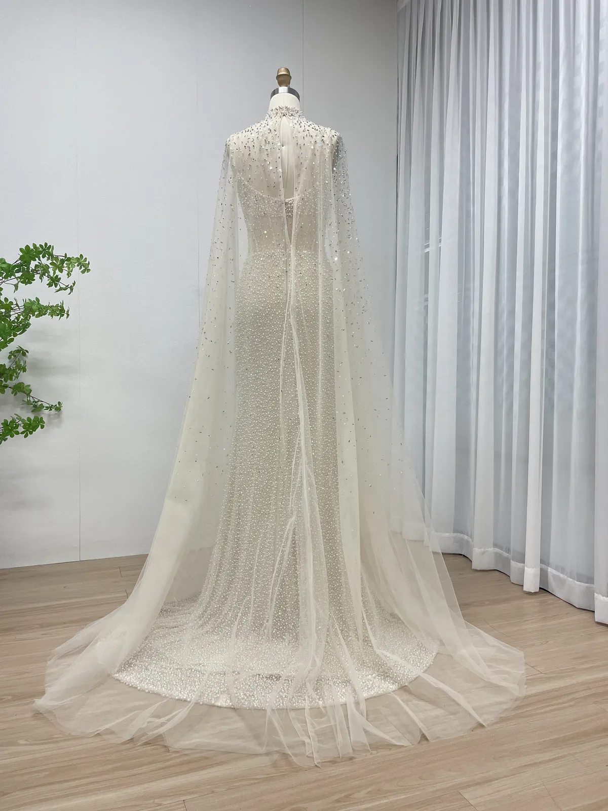 Ivory Pearl Beaded Mermaid Evening Dress with Detachable Sheer High-Neck Cape MB40312