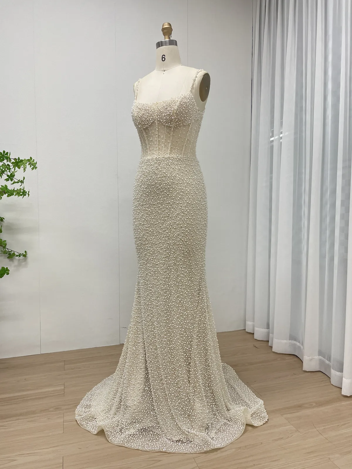 This ivory pearl beaded evening dress is a true statement of luxury and refined craftsmanship. Designed with a figure-hugging mermaid silhouette, the gown is fully embellished with delicate pearls, creating a rich texture and elegant shimmer from bodice to hem.