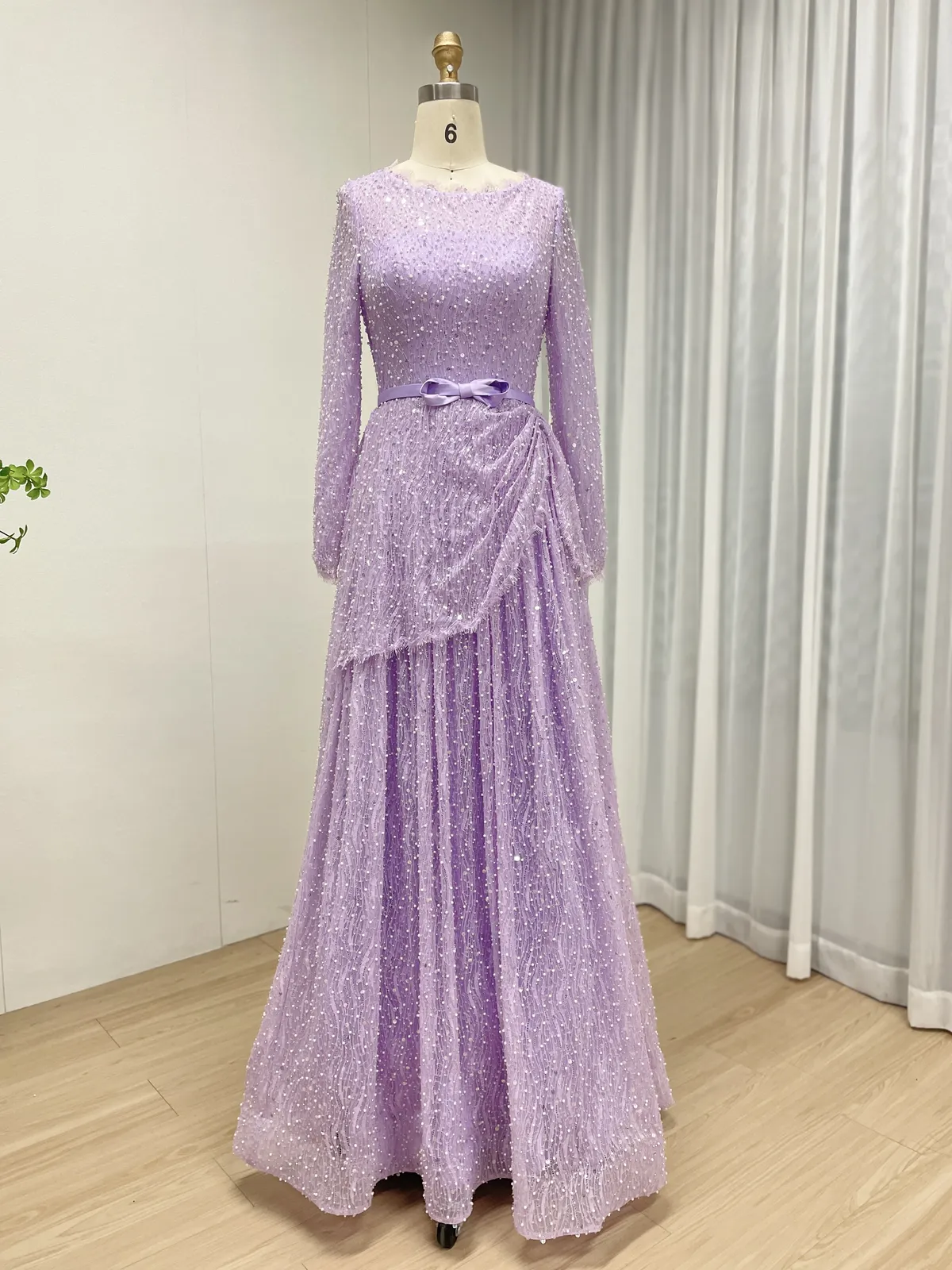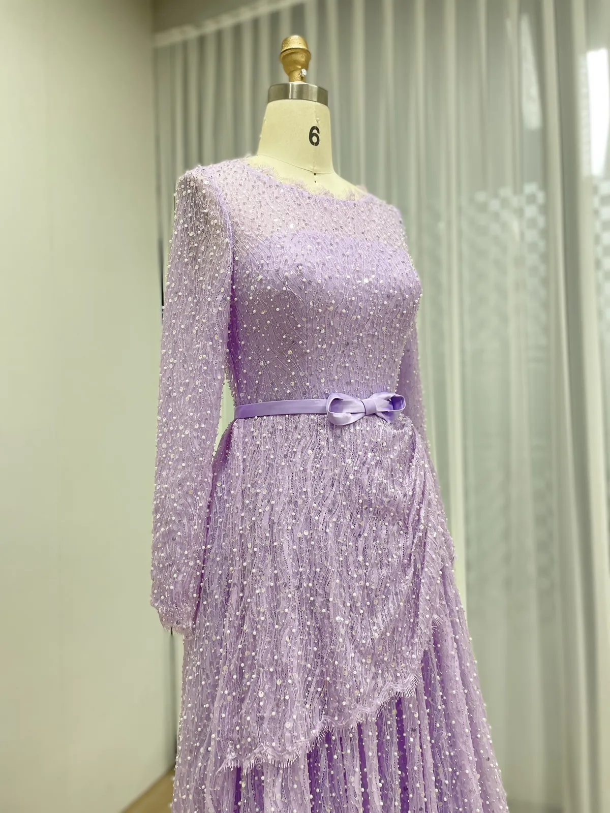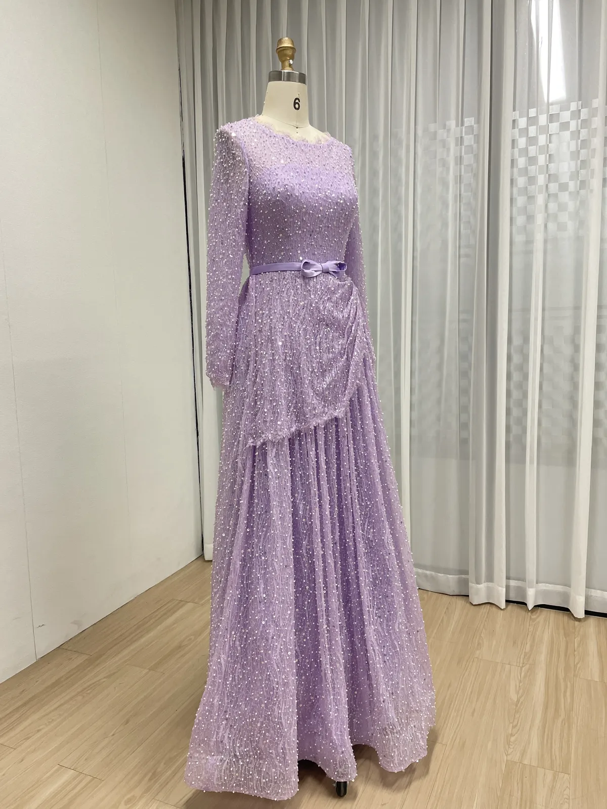 Lavender Long Sleeve Beaded Evening Gown with Bow Belt & Layered Draping MY30221