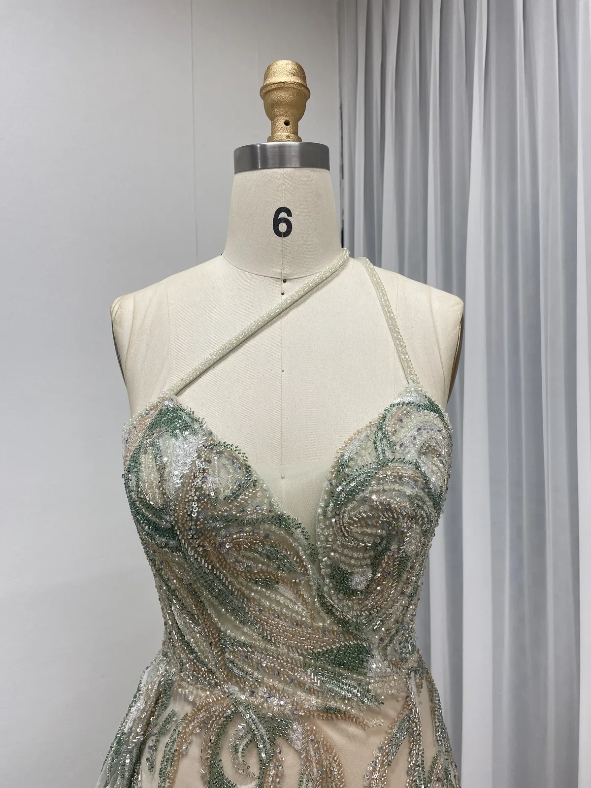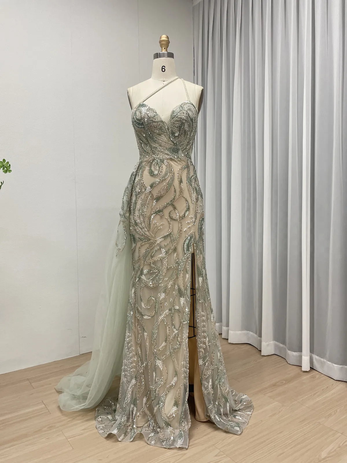 This light green evening gown showcases a striking one-shoulder design paired with exquisite hand-beaded detailing, creating a refined and luxurious statement. The fitted bodice is richly embellished with swirling bead patterns that sculpt the body beautifully, offering a flattering and elegant silhouette.