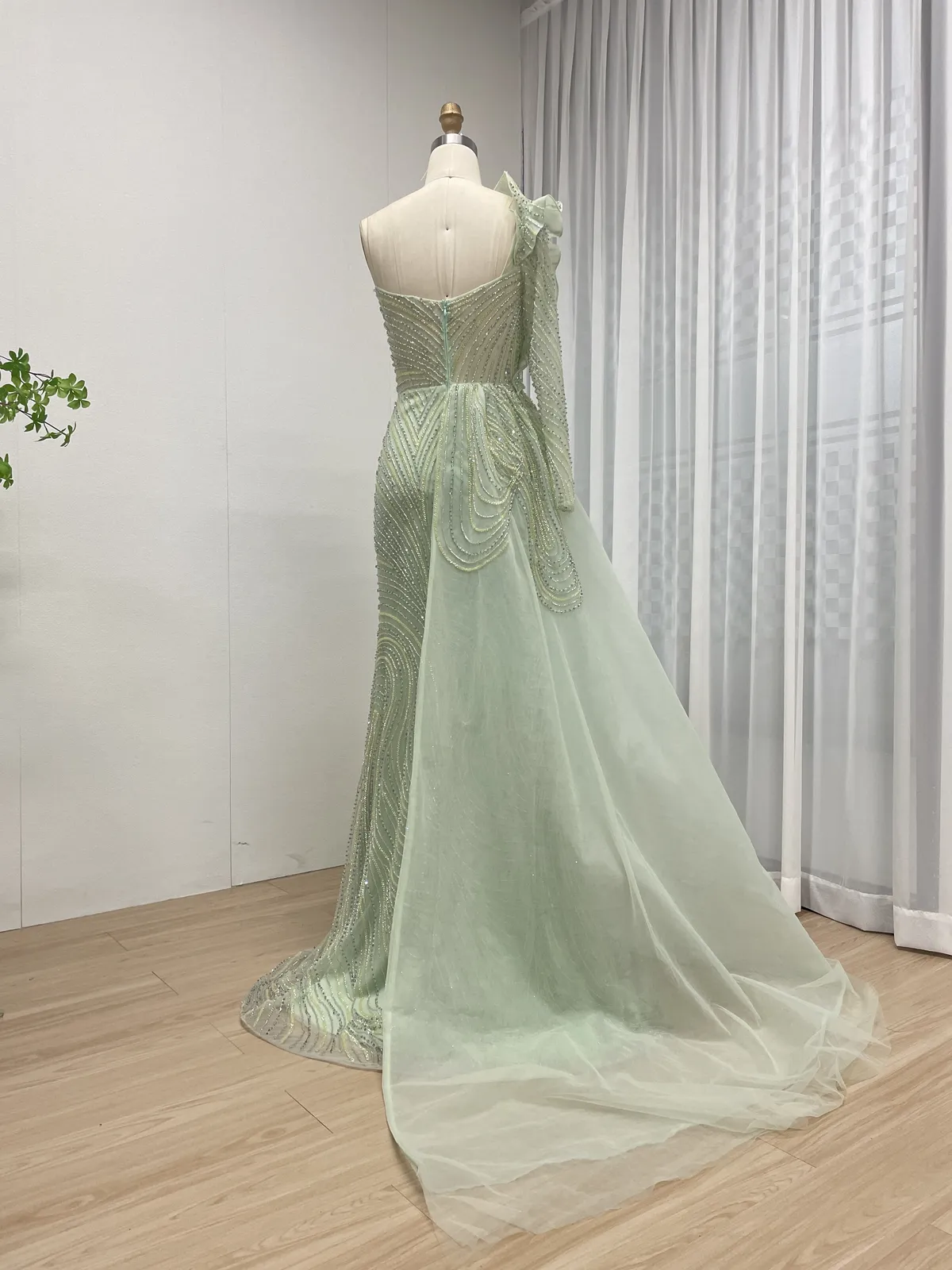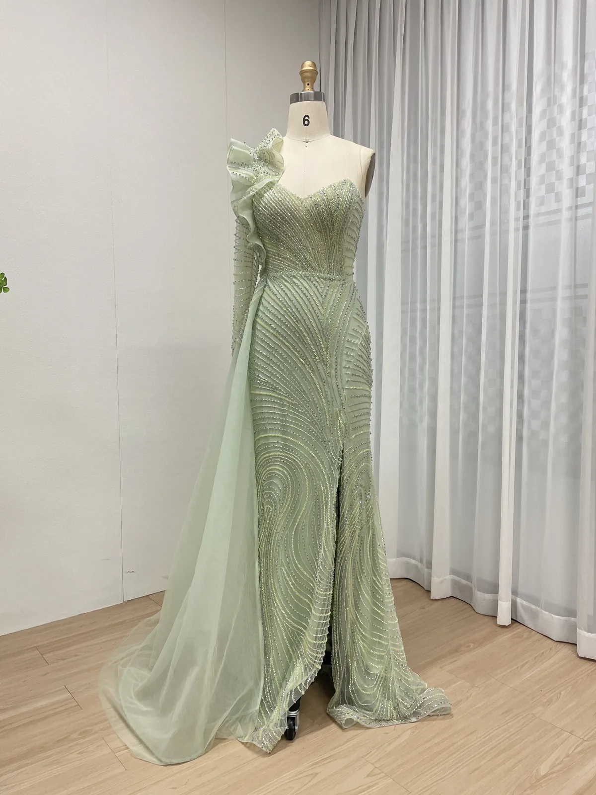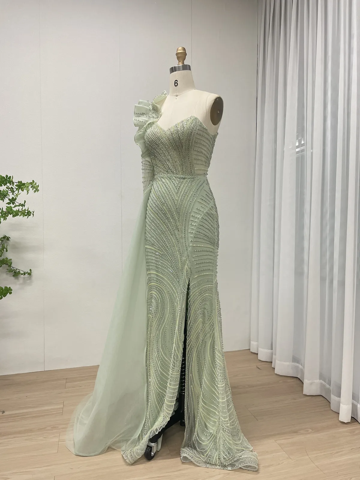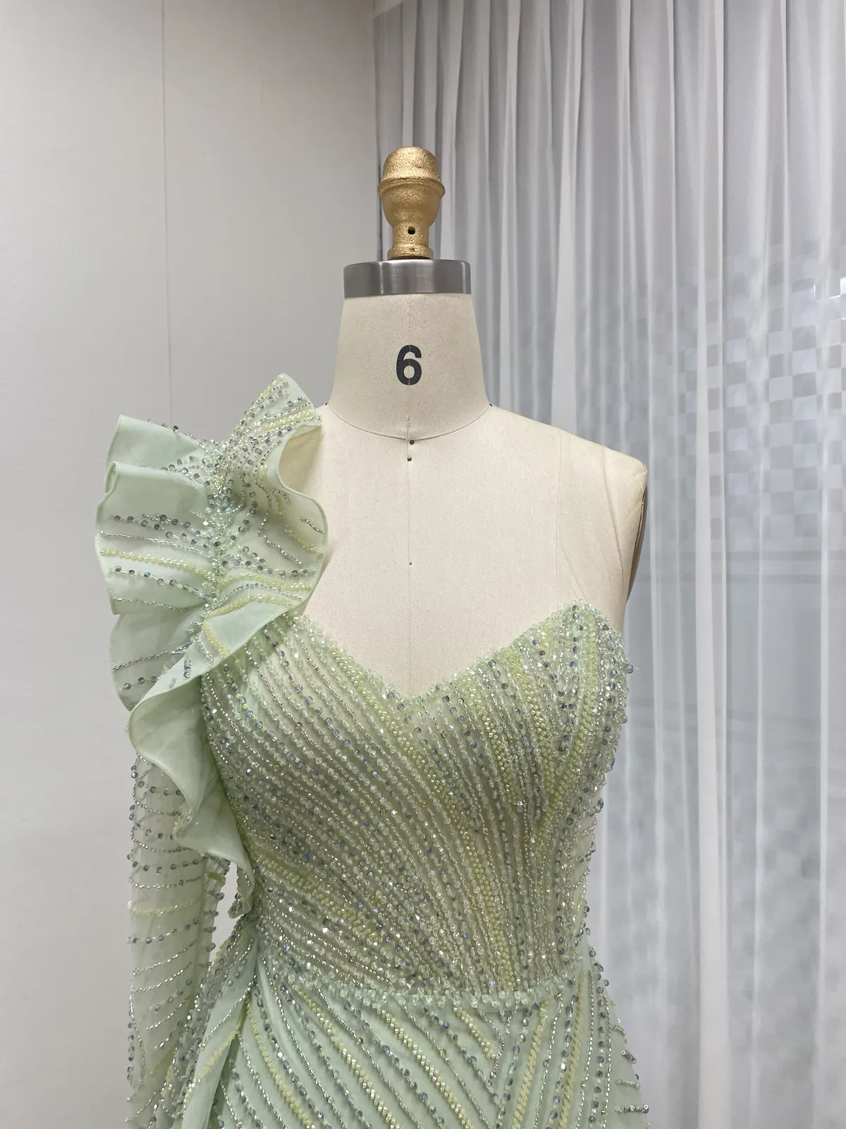 Light Green One-Shoulder Beaded Mermaid Evening Dress with Ruffle Detail and Tulle Side Train MB40314
