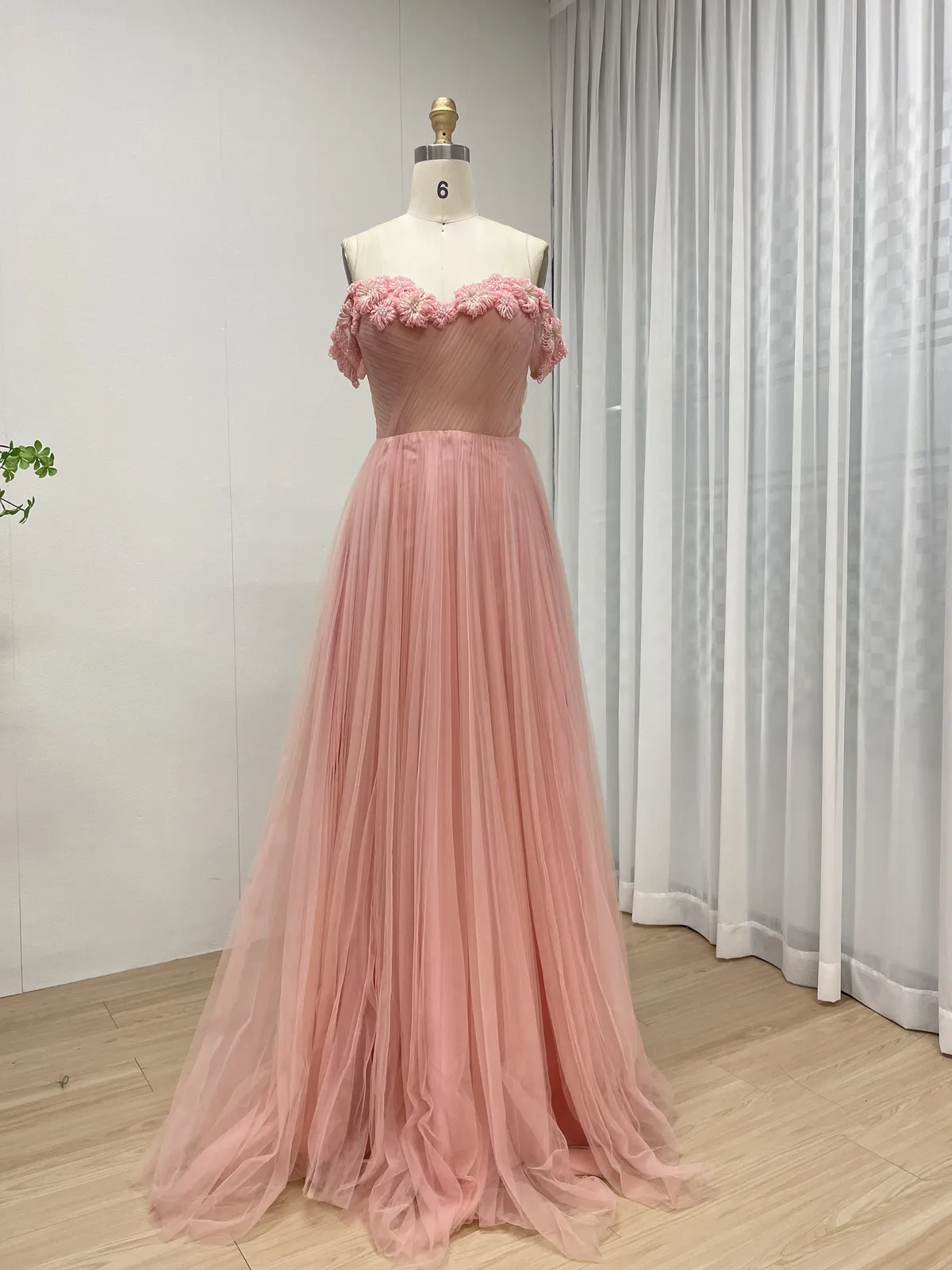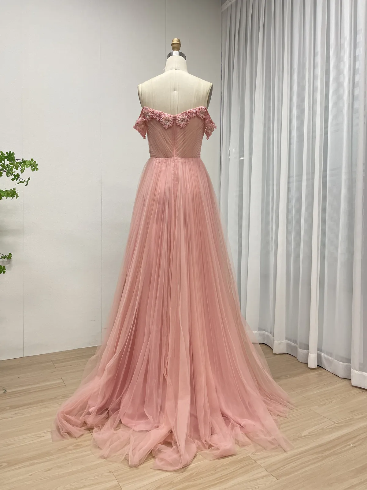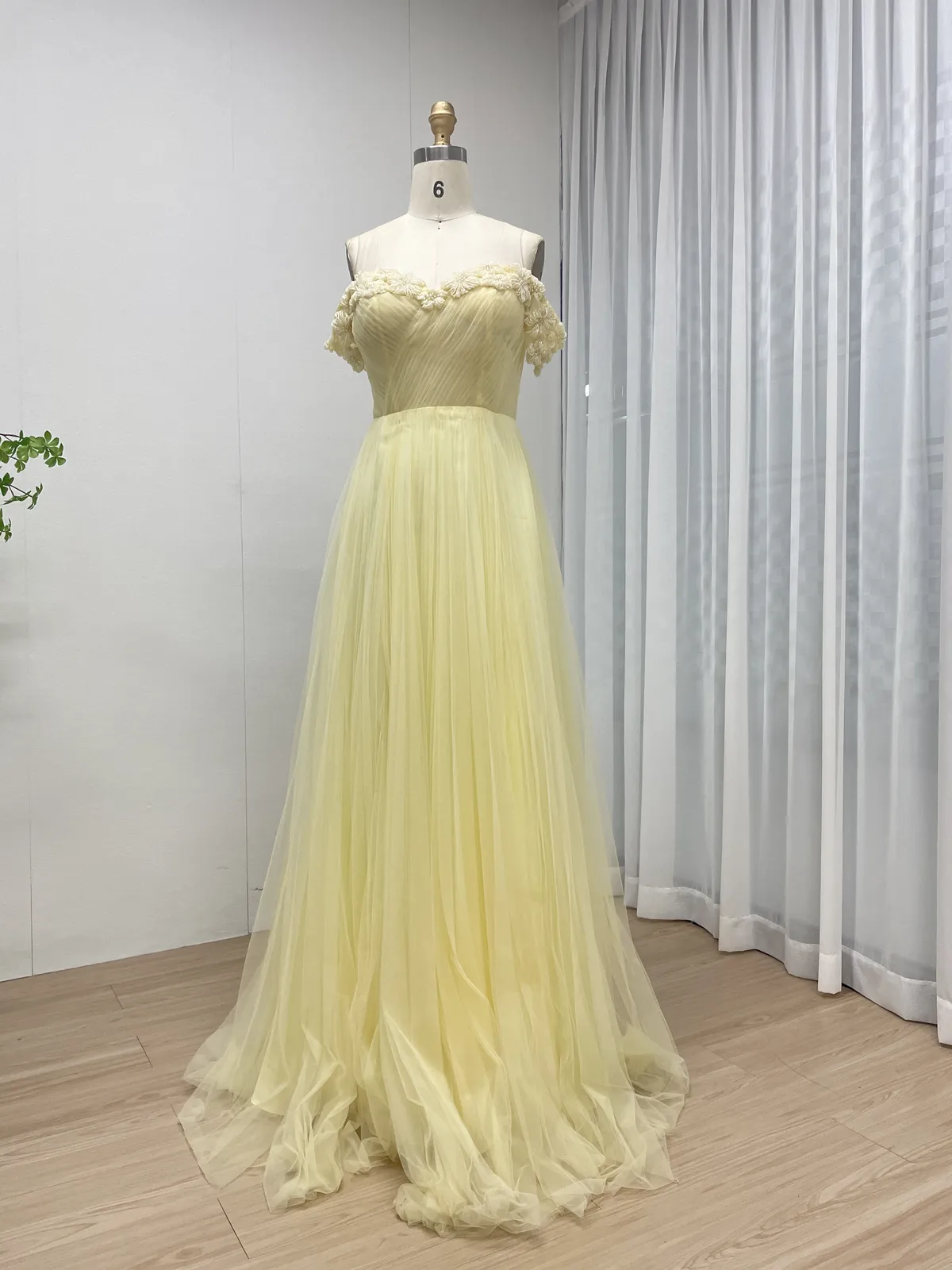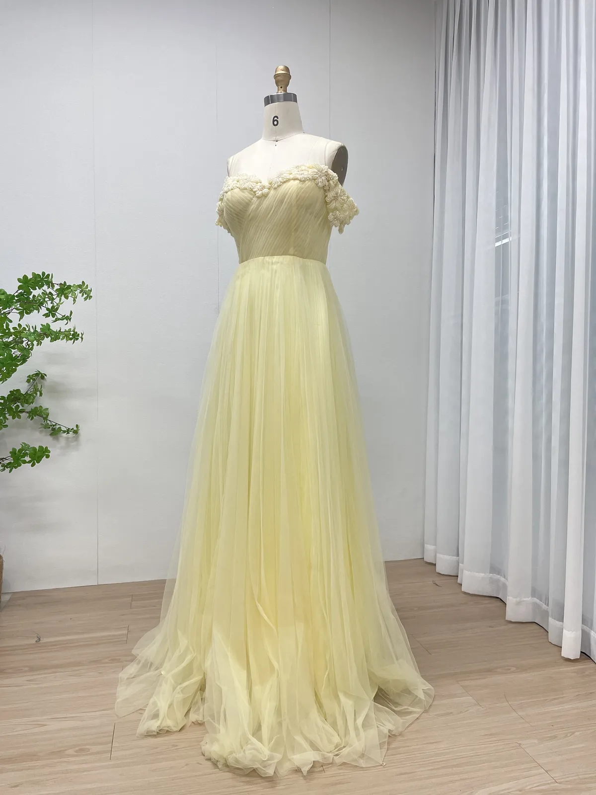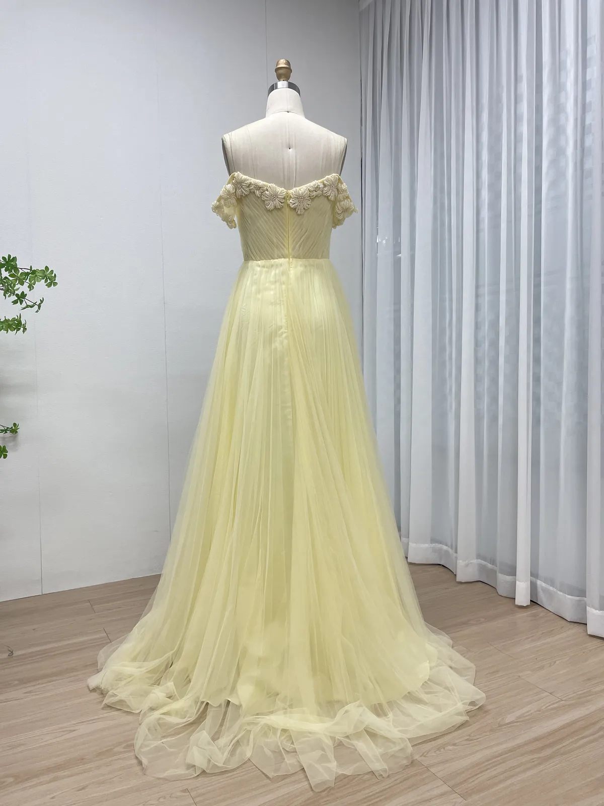 This light yellow off-shoulder evening dress is designed with a romantic and elegant silhouette, perfect for formal occasions and special events. The fitted bodice features soft diagonal ruching that enhances the waistline, while delicate floral appliqué trims the off-shoulder neckline, adding a refined feminine touch.