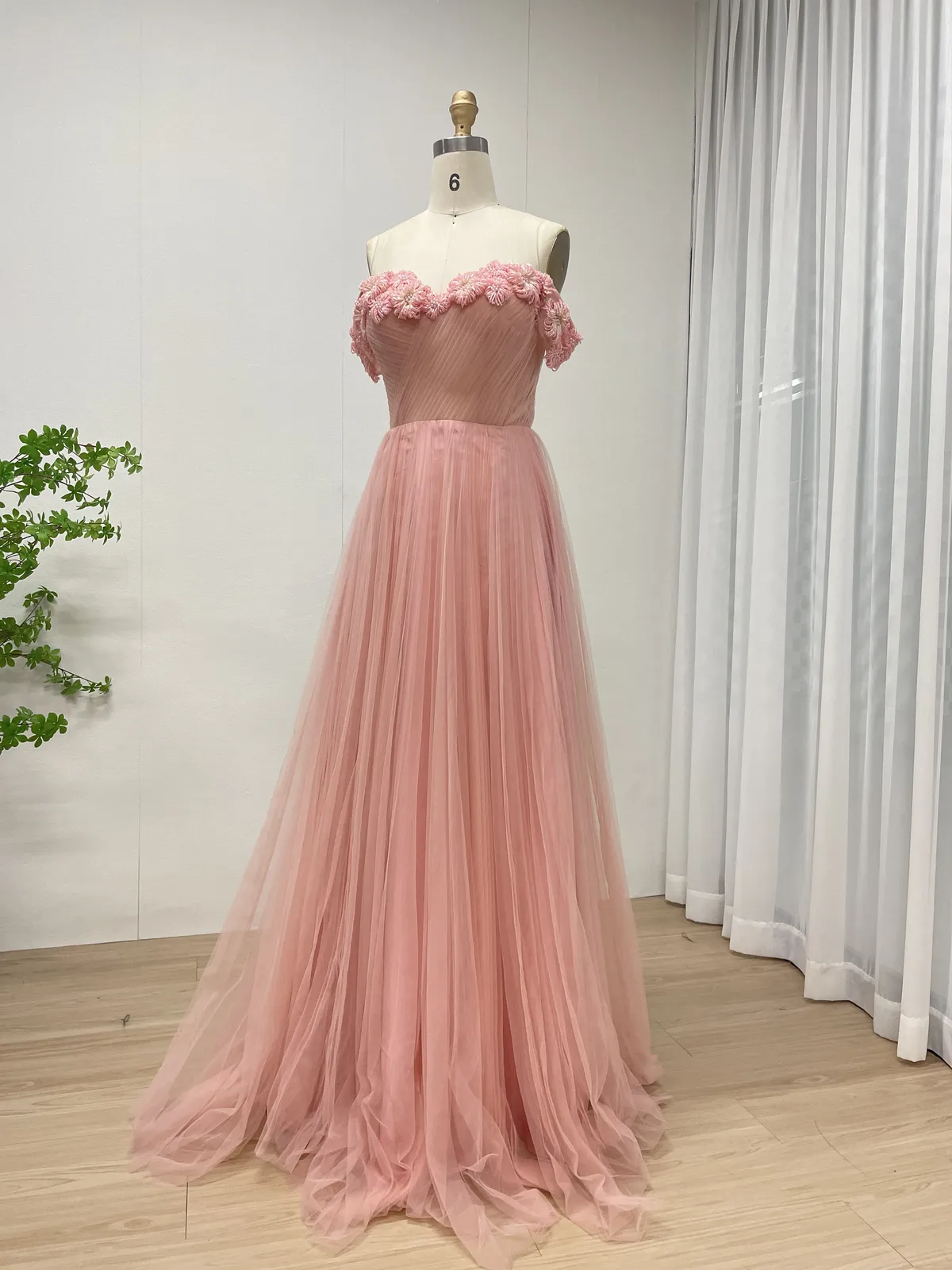 Light Yellow Off Shoulder Chiffon Evening Dress with Floral Appliqué Wholesale Formal Gown MB40315
