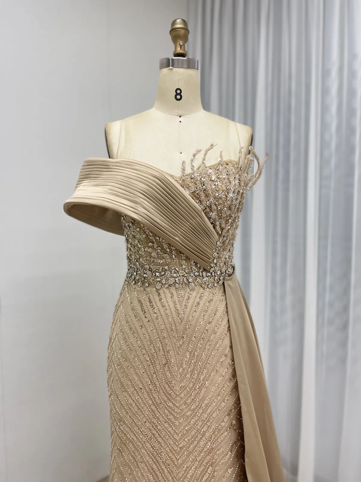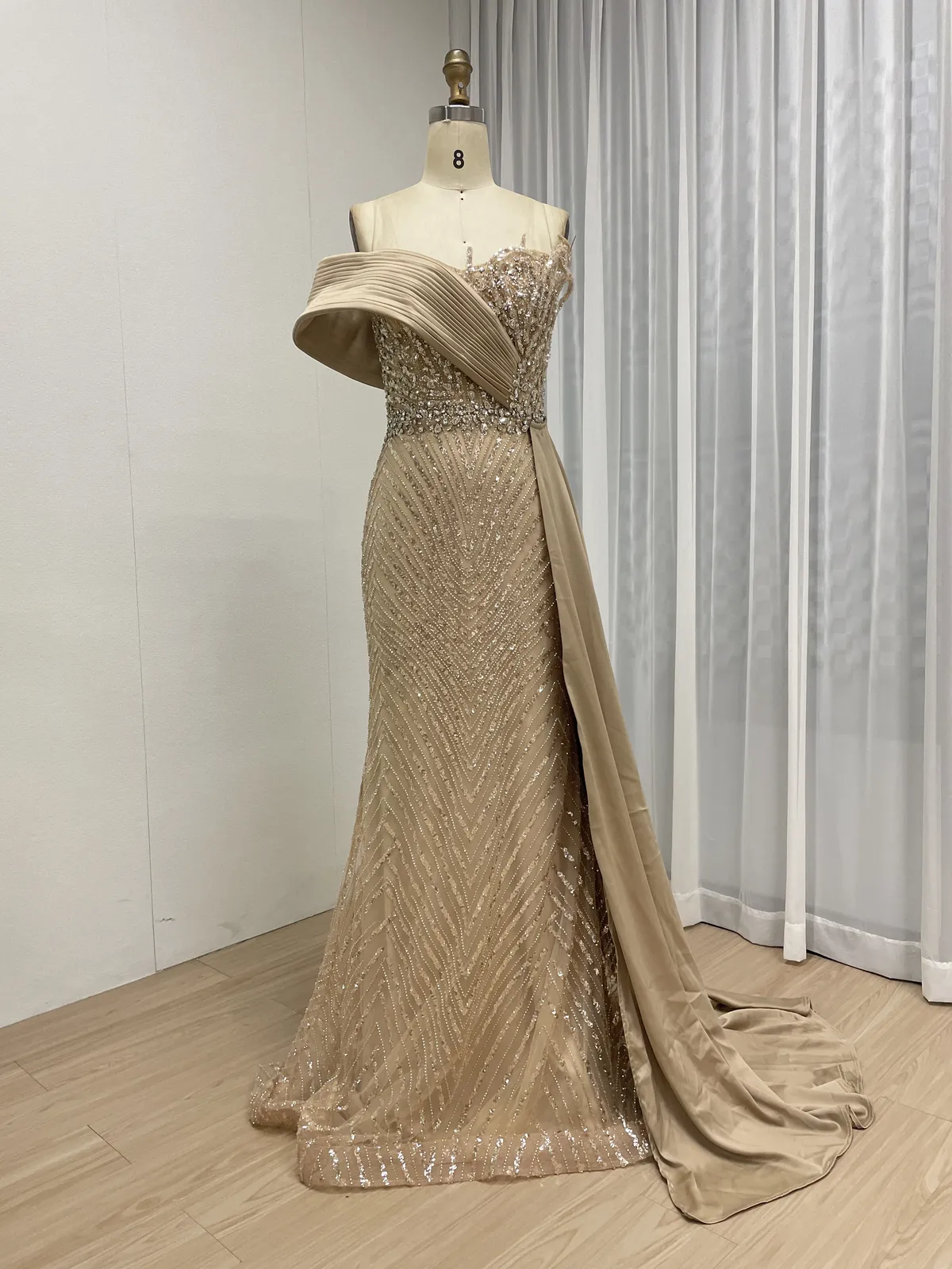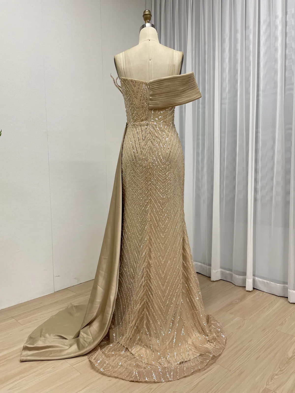 This luxury champagne evening dress features a sophisticated one-shoulder design enhanced with elegant pleated draping that wraps gracefully across the bodice. Fully adorned with intricate hand-beaded patterns, the gown delivers a refined shimmer under light, making it an ideal choice for upscale formal occasions.