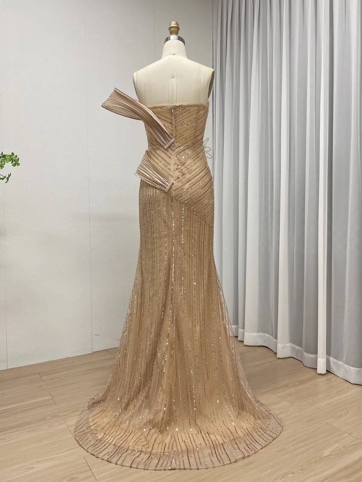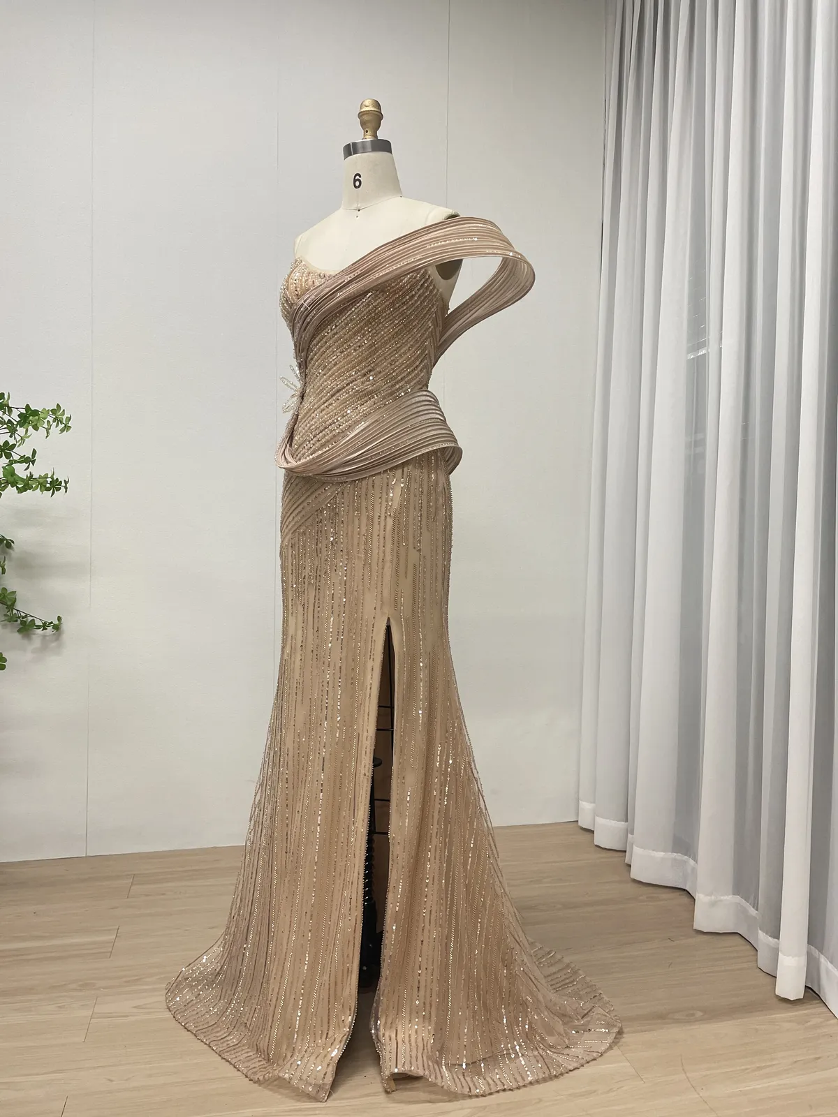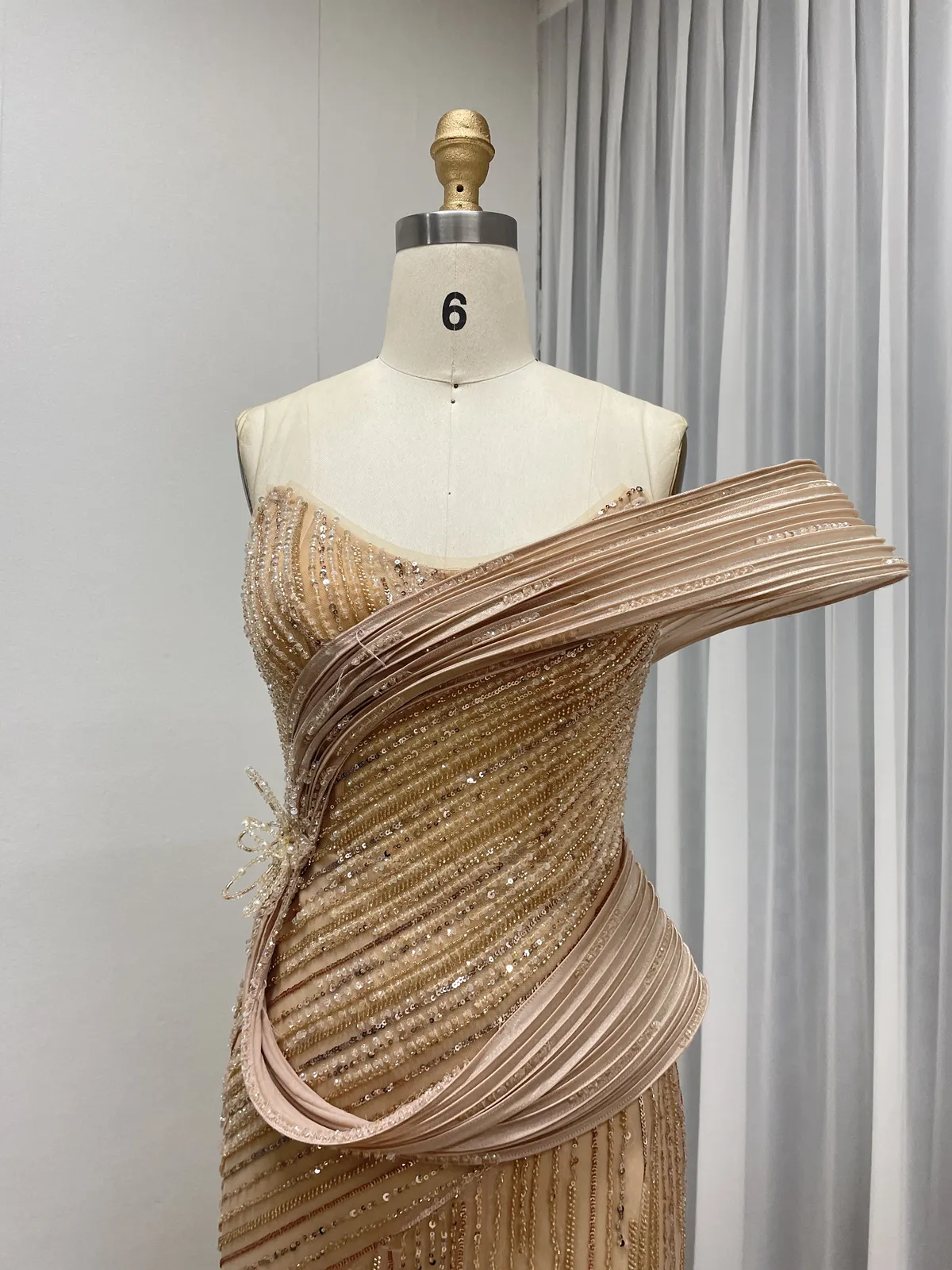 This luxury champagne evening gown features an elegant one-shoulder sculptural neckline with dramatic pleated detailing, creating a striking couture silhouette. Crafted with dense hand-beaded embellishment over soft tulle, this gown delivers a refined balance of modern artistry and timeless glamour — ideal for high-end formal occasions.