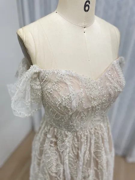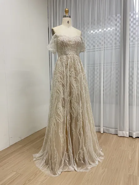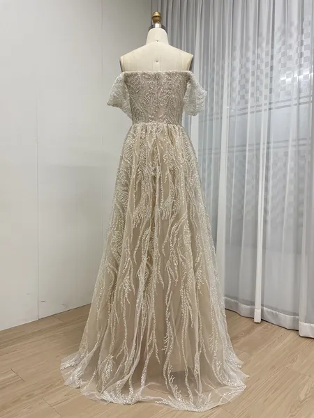 Step into a fairytale with this enchanting and whimsical gown. This dress features a timeless A-line silhouette that gracefully flows from a cinched waist. The entire gown is crafted from a delicate, sheer tulle adorned with a shimmering glitter pattern that creates a captivating, all-over sparkle. The romantic off-the-shoulder neckline is framed by a subtle, draped ruffle, adding a soft and ethereal touch. This elegant and lightweight gown is perfect for a prom, a formal garden party, or a wedding, offering a look that is both effortless and magical.