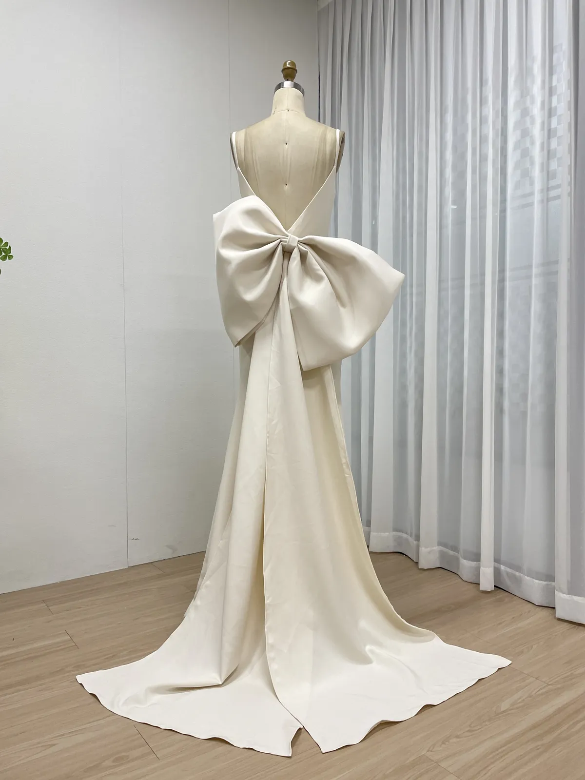 The true showstopper of this gown is the magnificent, oversized bow that adorns the back. This architectural detail adds a sculptural and dramatic element, creating a breathtaking profile as you make your entrance and exit. Crafted from luxurious, smooth satin, this dress is perfect for a modern wedding, a high-end gala, or any formal event where you want to combine classic elegance with a touch of daring style.