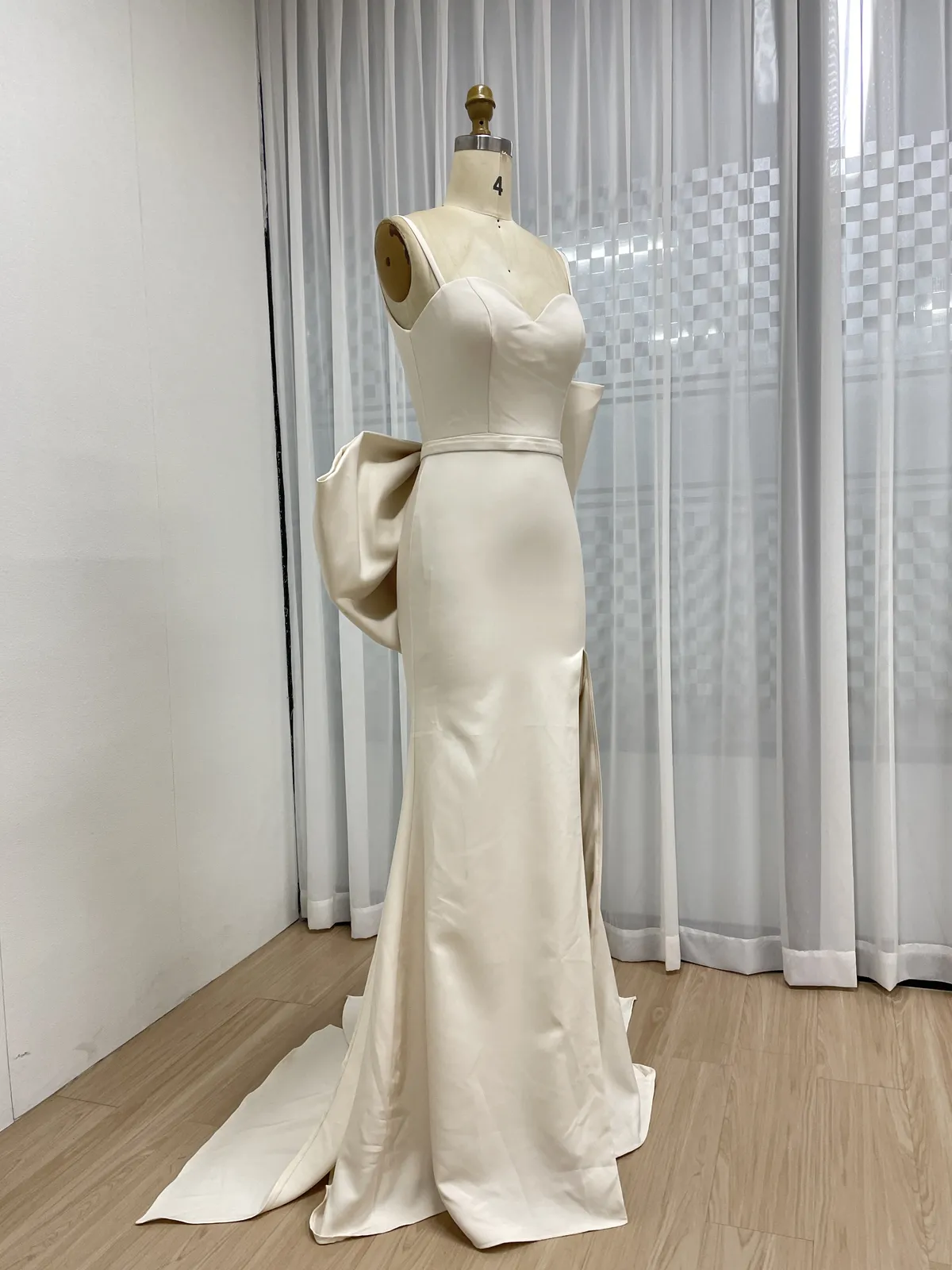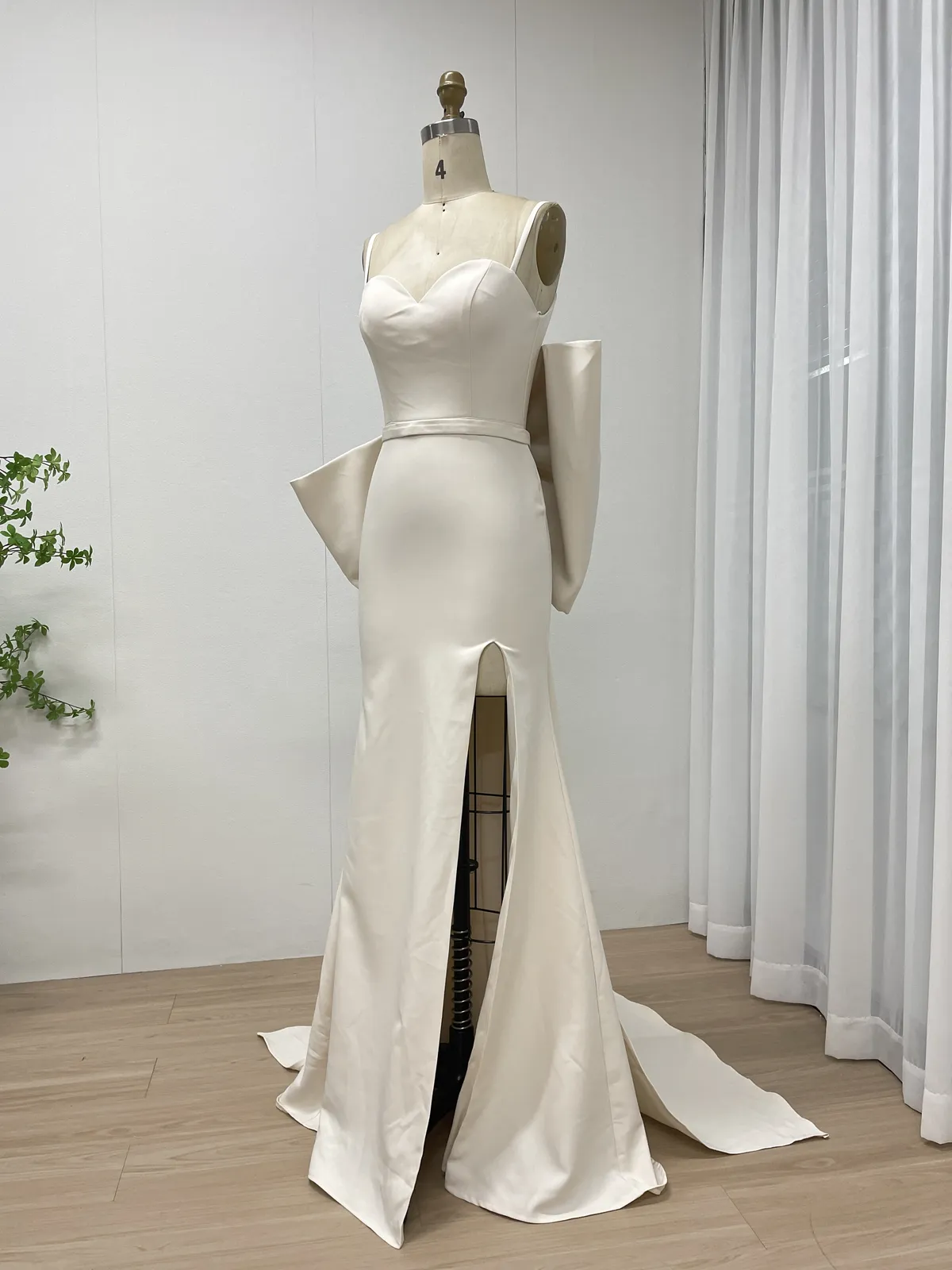 Modern Satin Mermaid Gown with High Slit and Dramatic Back Bow MY30132-2