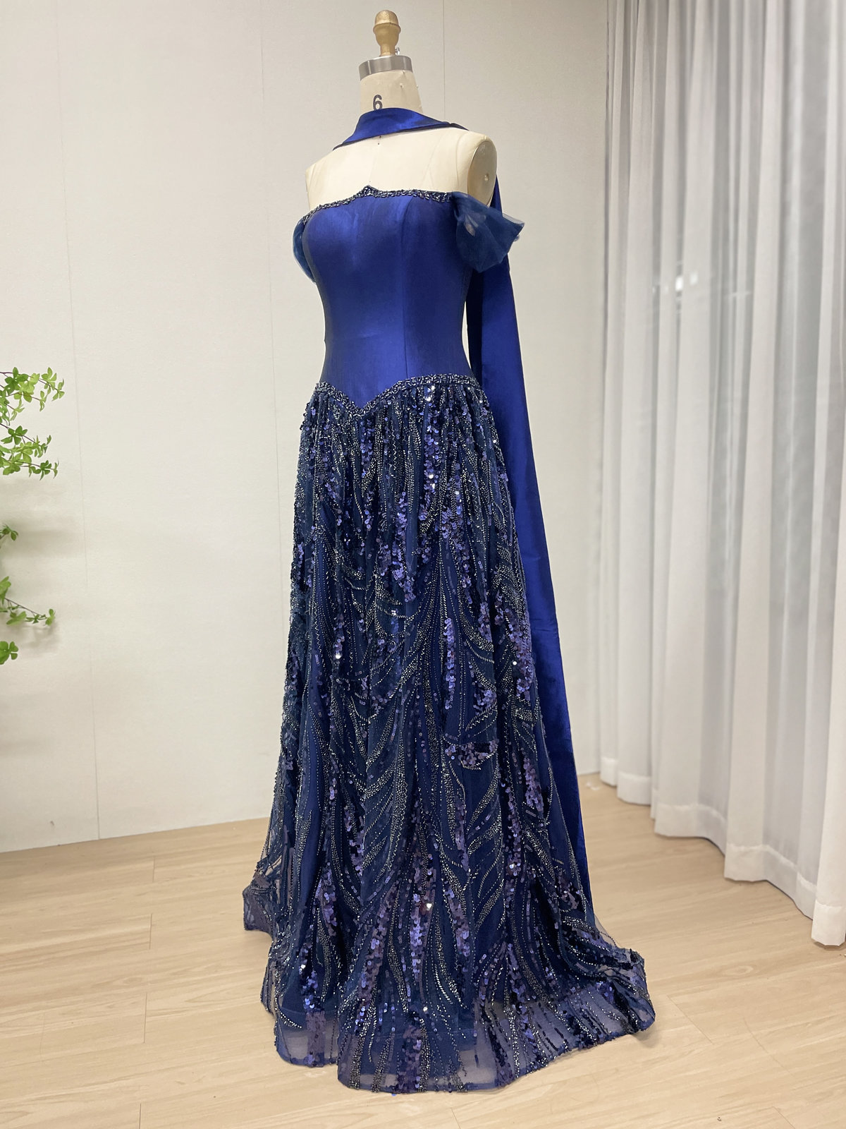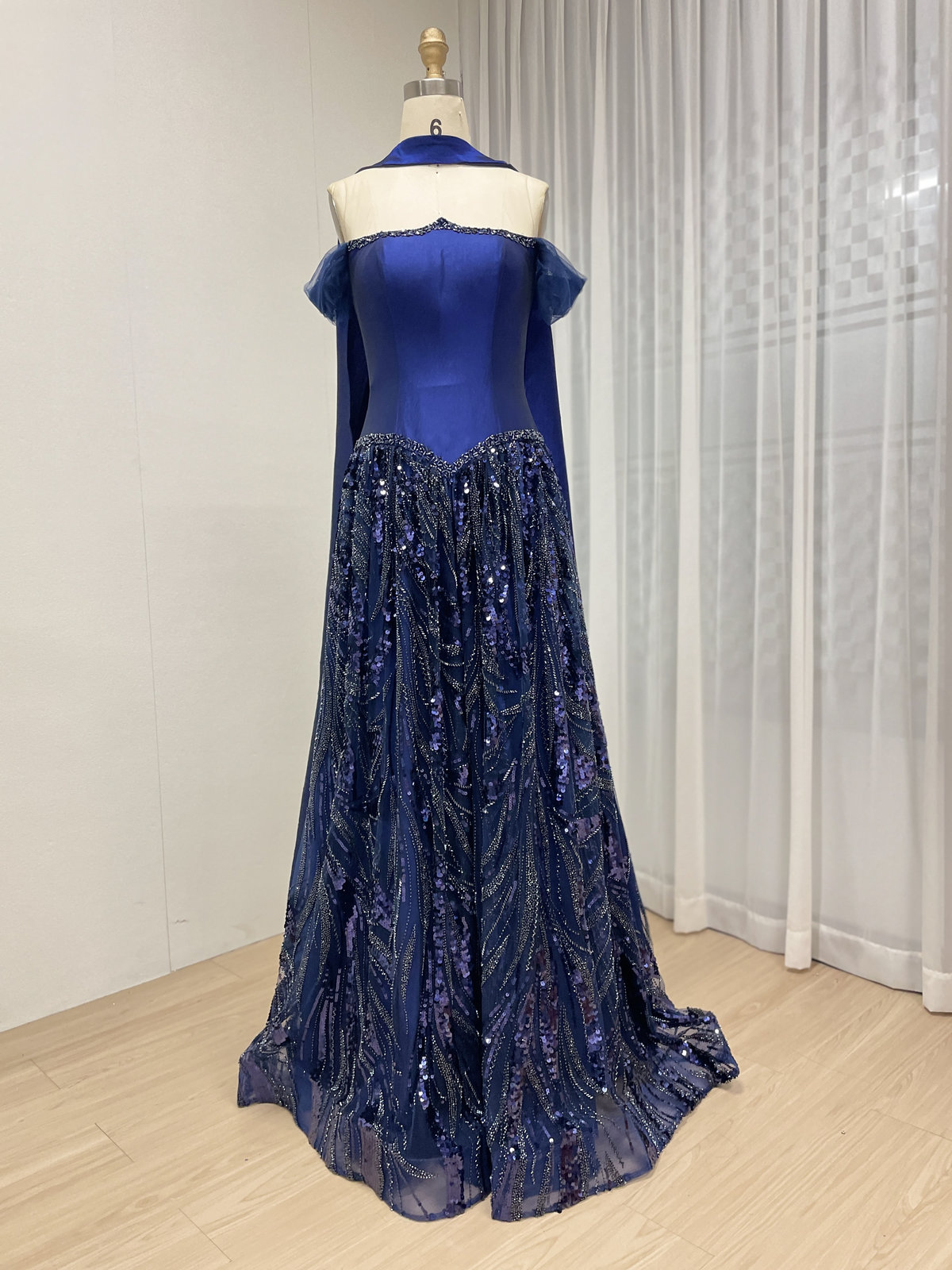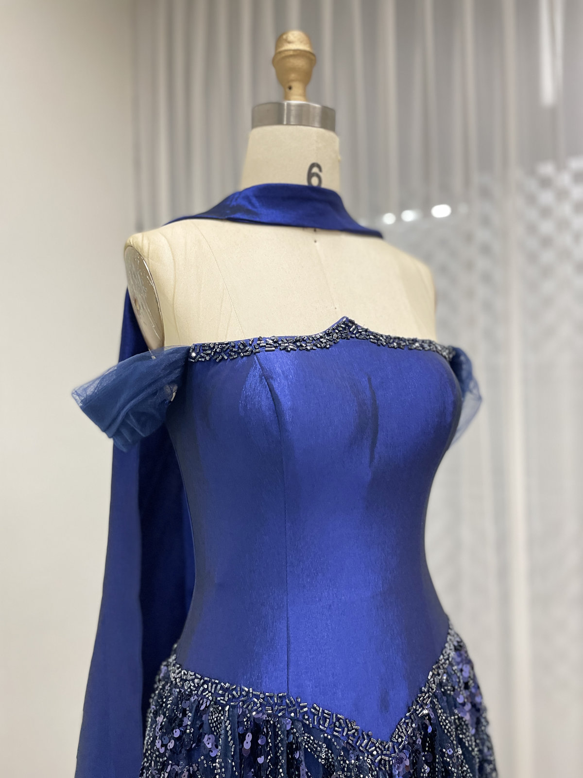 Royal Blue Off-Shoulder Satin Evening Gown with Sequin Embroidered Skirt and Long Back Scarf MY30201
