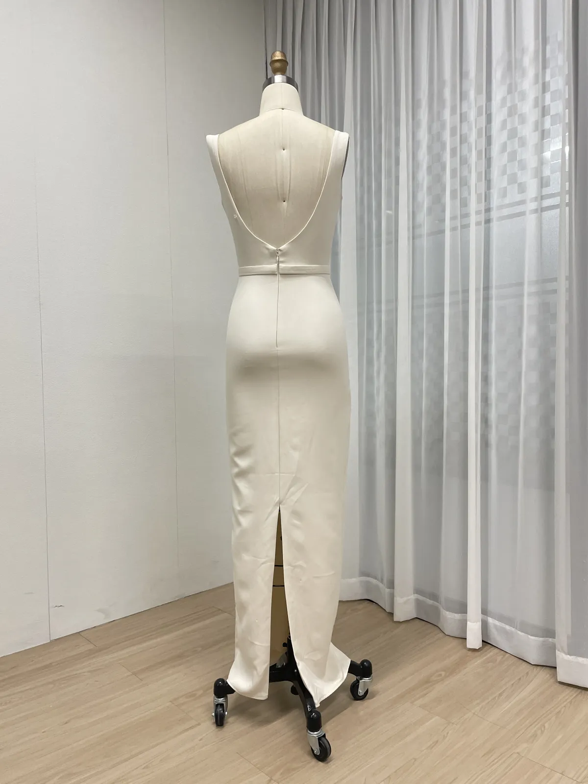 Elegance meets modern design in this stunning satin column gown. Crafted from luxurious, smooth satin, the dress features a refined square neckline and a sleeveless silhouette, offering a timeless and sophisticated look. A fitted bodice flows into a streamlined column skirt, creating a long and graceful line.