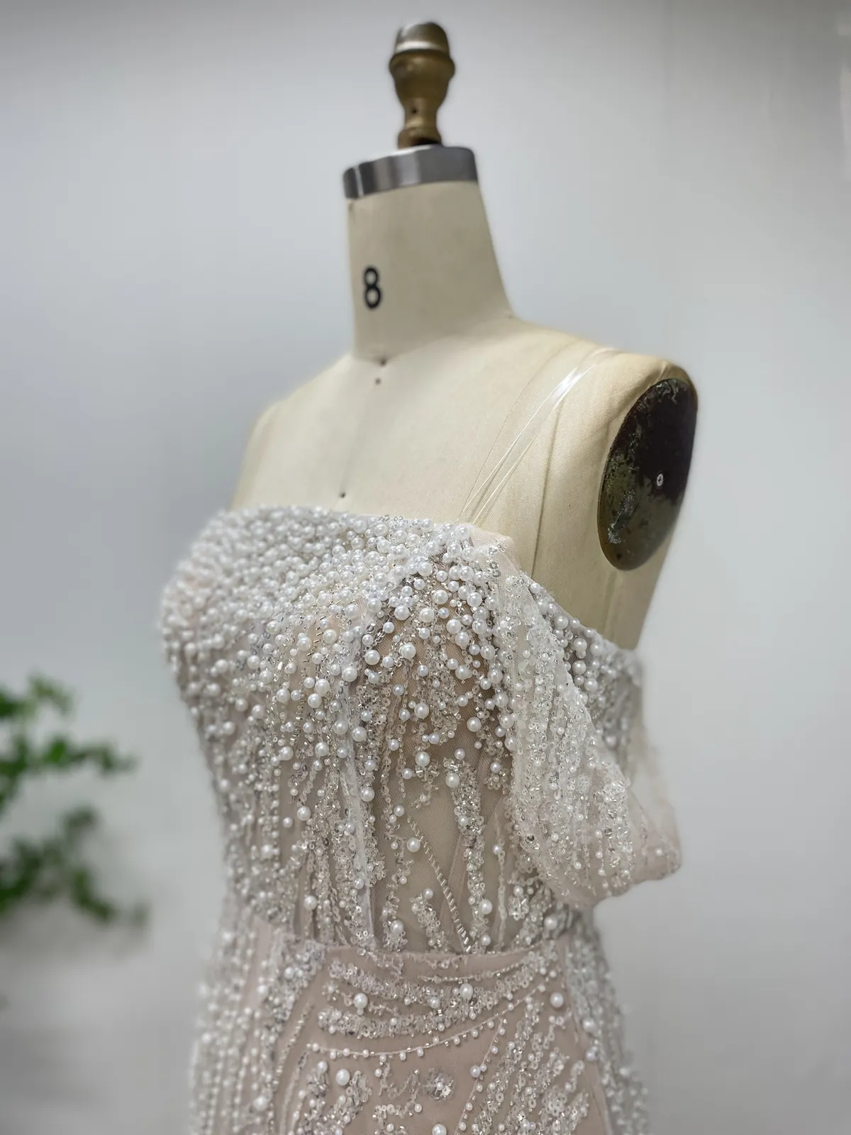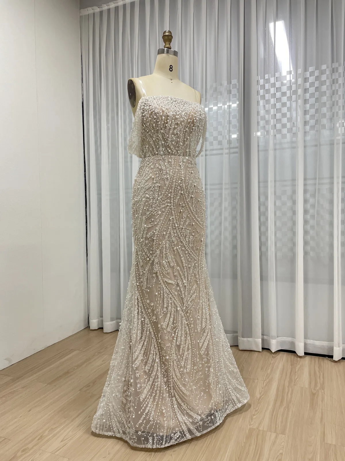 The design is enhanced by a unique layered bodice. A delicate, sheer beaded layer drapes gracefully over the strapless sweetheart neckline, creating a soft, ethereal effect. The luxurious beading, which includes pearls and crystals, rests on a subtle nude-toned lining, making the white embellishments pop beautifully. Perfect for a formal wedding, gala, or any red-carpet event, this gown is a true statement of luxurious sophistication.